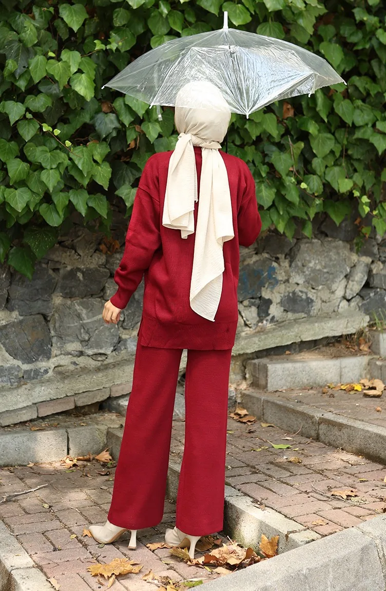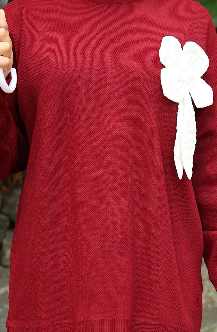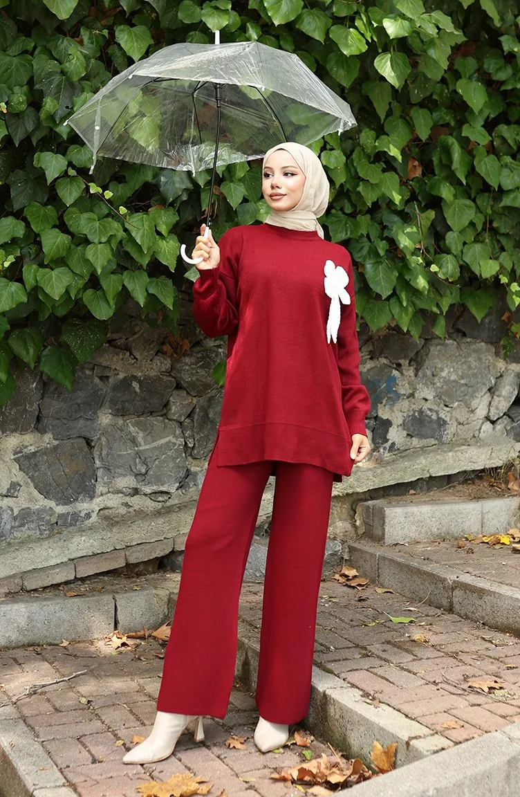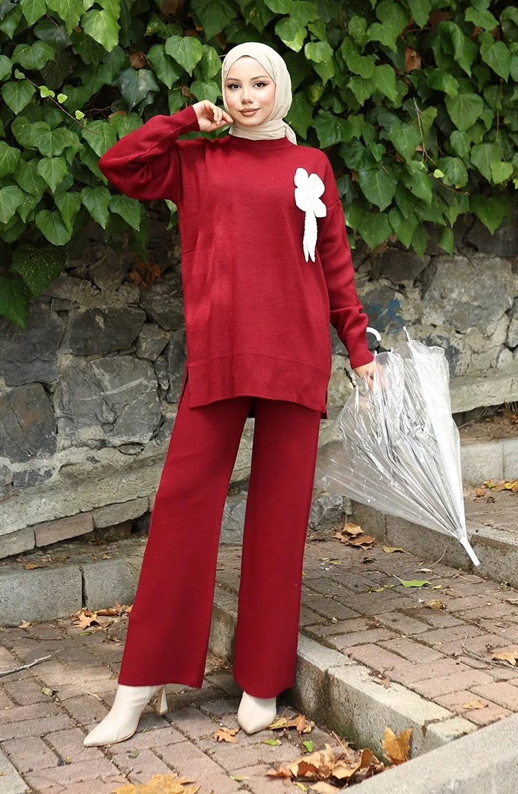 Ensemble Deux Pièces En Tricot Tunique Et Pantalon à Détails Floraux 1028-04 Bordeaux 1028-04