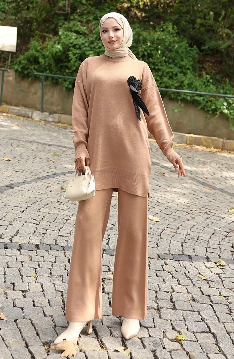 Ensemble Deux Pièces En Tricot Tunique Et Pantalon à Détails Floraux 1028-07 Café Au Lait 1028-07