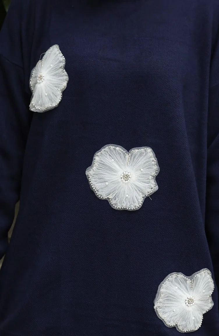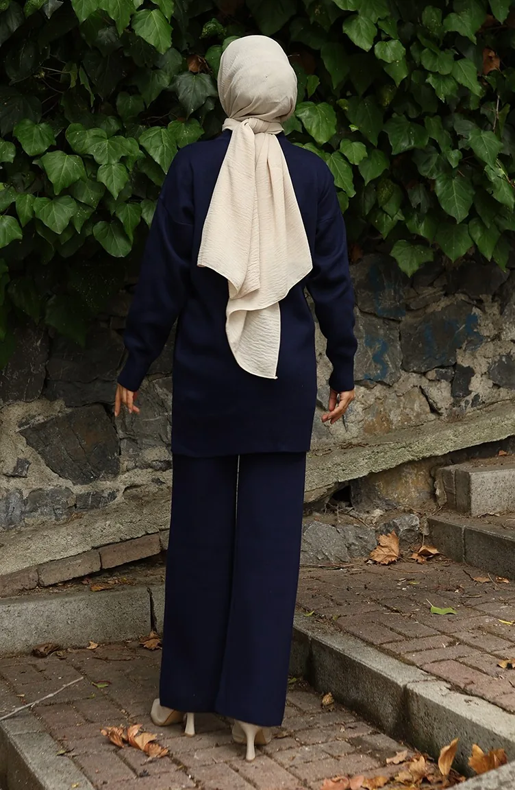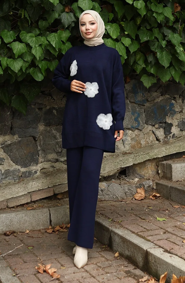 Ensemble Deux Pièces En Tricot Tunique Et Pantalon Brodés De Perles 1016-01 Bleu Marine 1016-01