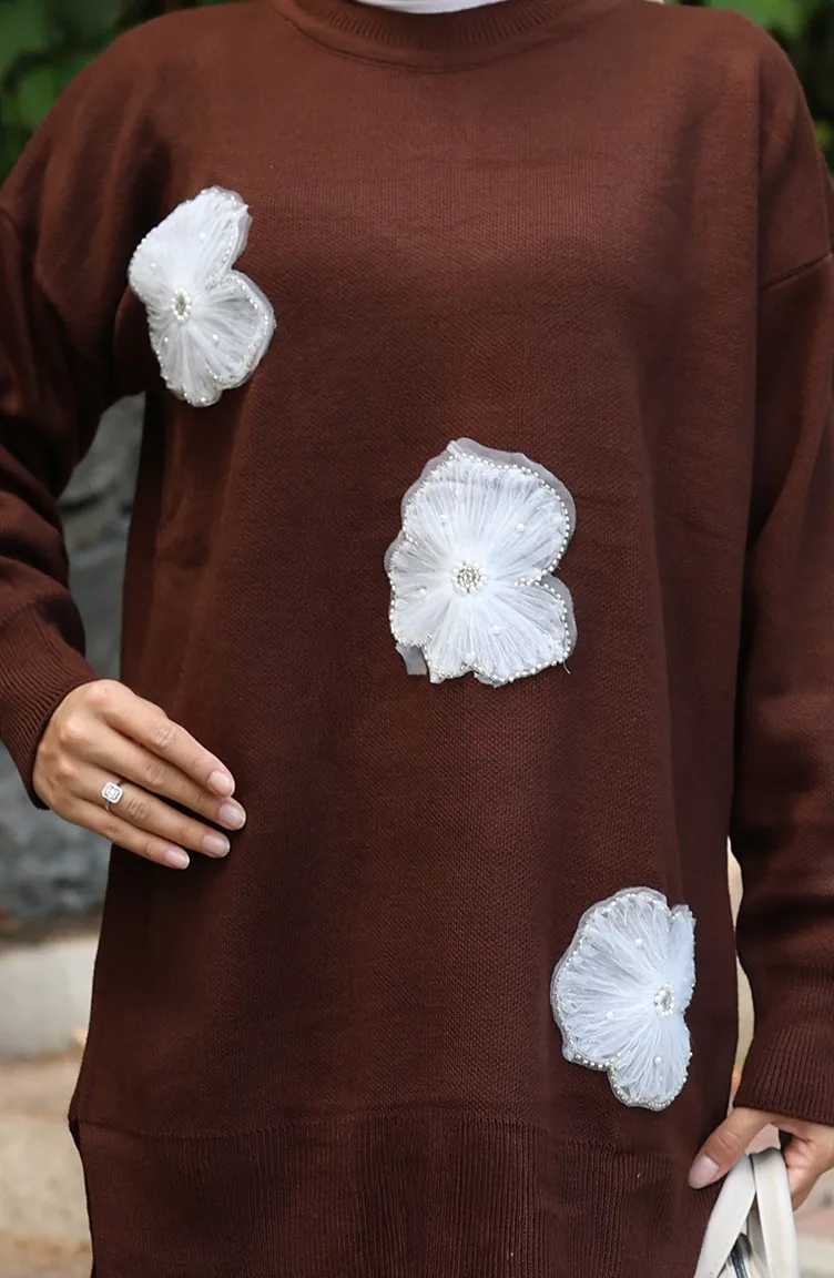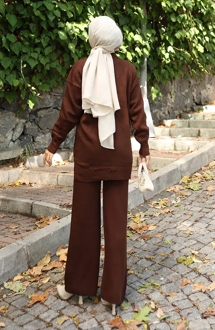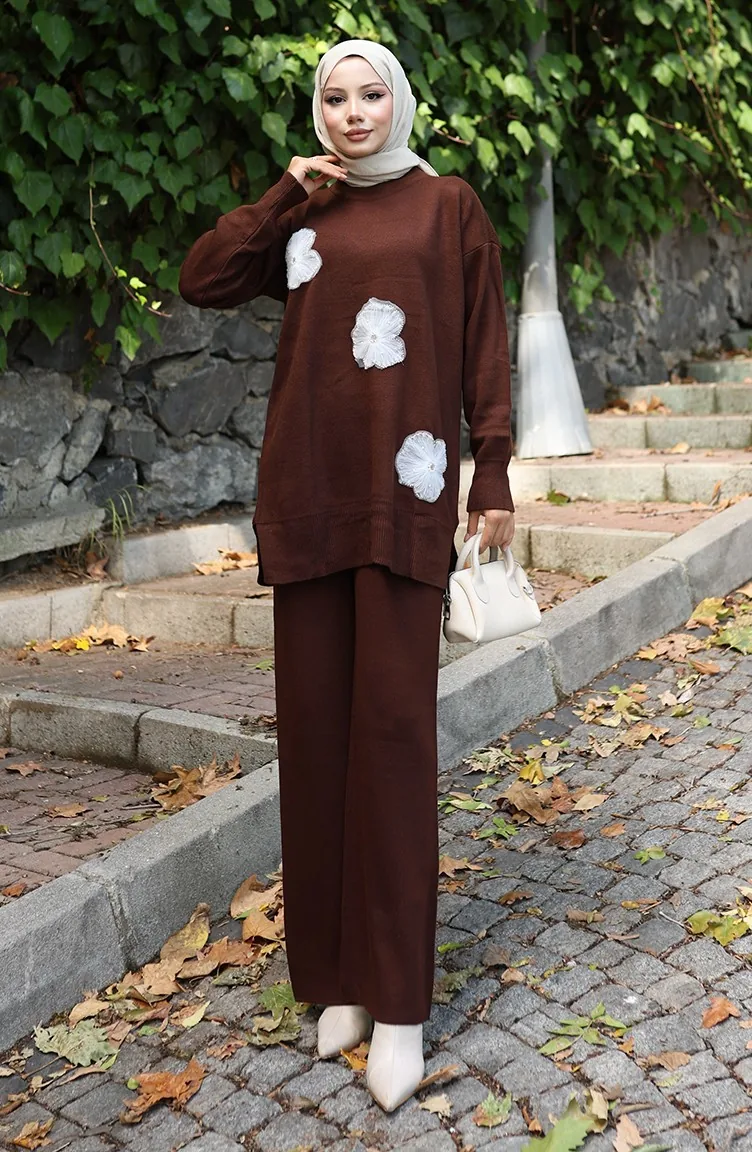 Ensemble Deux Pièces En Tricot Tunique Et Pantalon Brodés De Perles 1016-03 Marron 1016-03