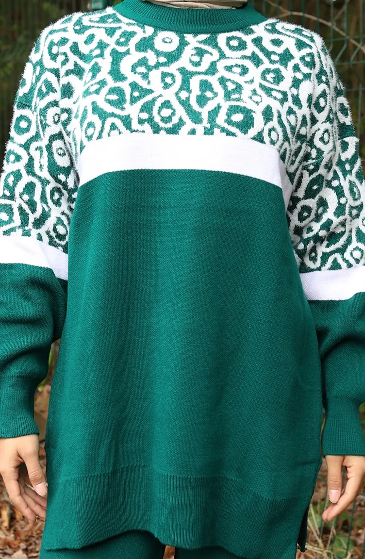 Ensemble Deux Pièces En Tricot Tunique Et Pantalon Garnis Motif 1013-03 Vert émeraude 1013-03
