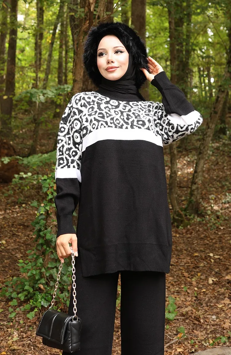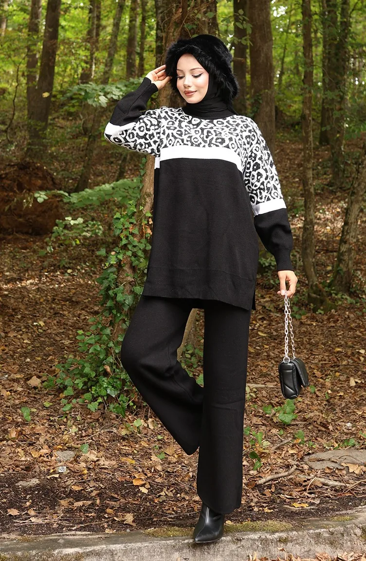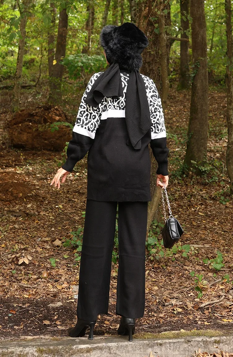 Ensemble Deux Pièces En Tricot Tunique Et Pantalon Garnis Motif 1013-05 Noir 1013-05