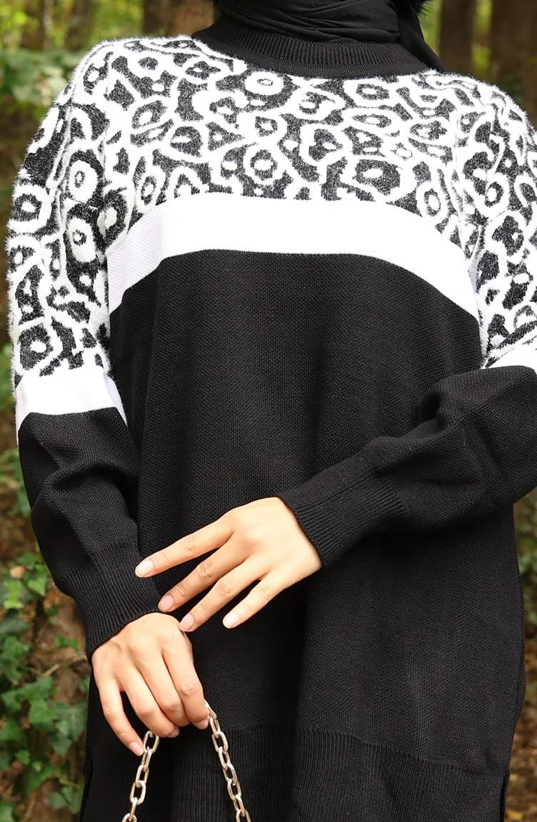 Couleur Noire. Tissu acrylique. Tissu à motifs. Tunique. Hivernal. Garni a deux types de tissus.