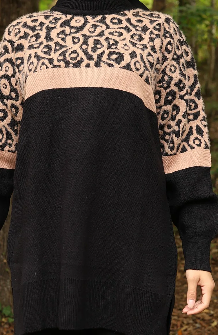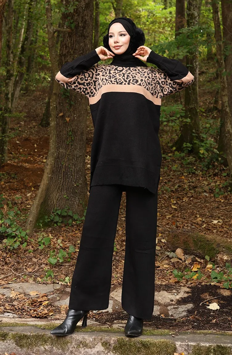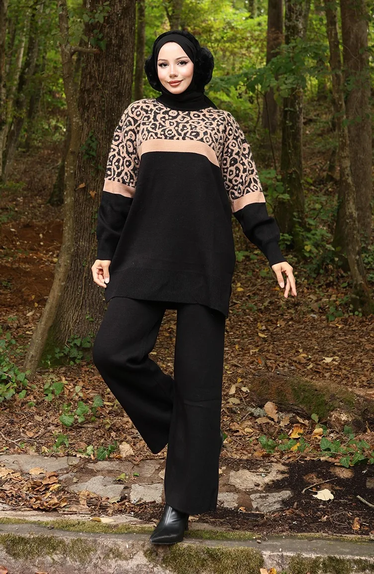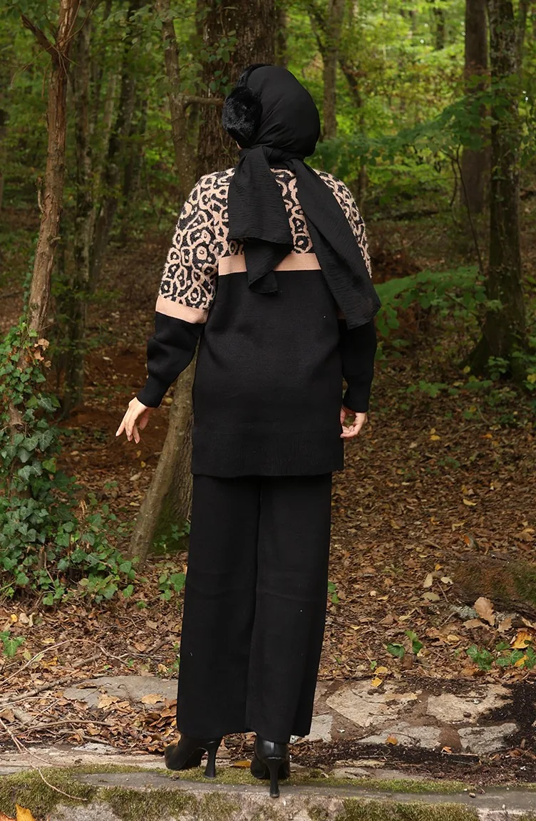 Ensemble Deux Pièces En Tricot Tunique Et Pantalon Garnis Motif 1013-08 Noir Café Au Lait 1013-08