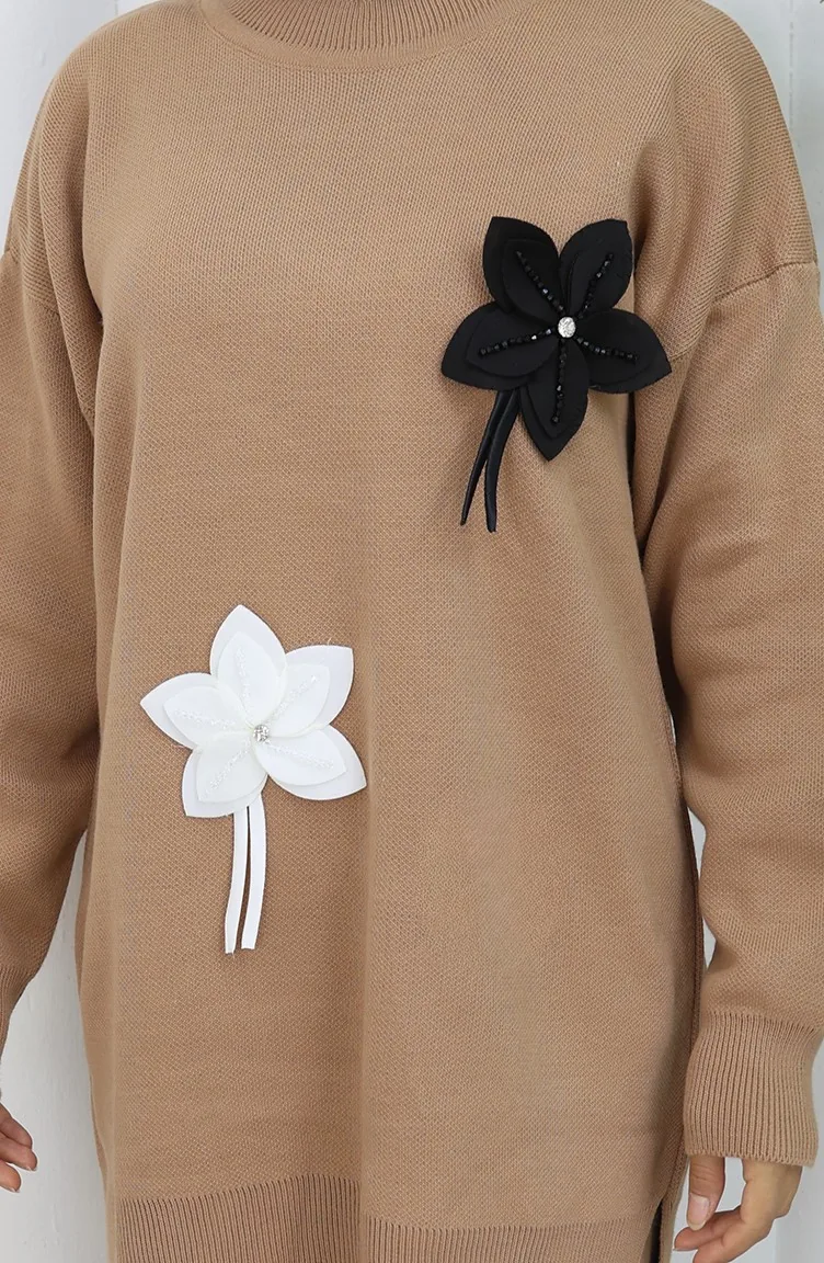 Ensemble Deux Pièces En Tricot Tunique Florale Et Pantalon 1077-05 Café Au Lait 1077-05