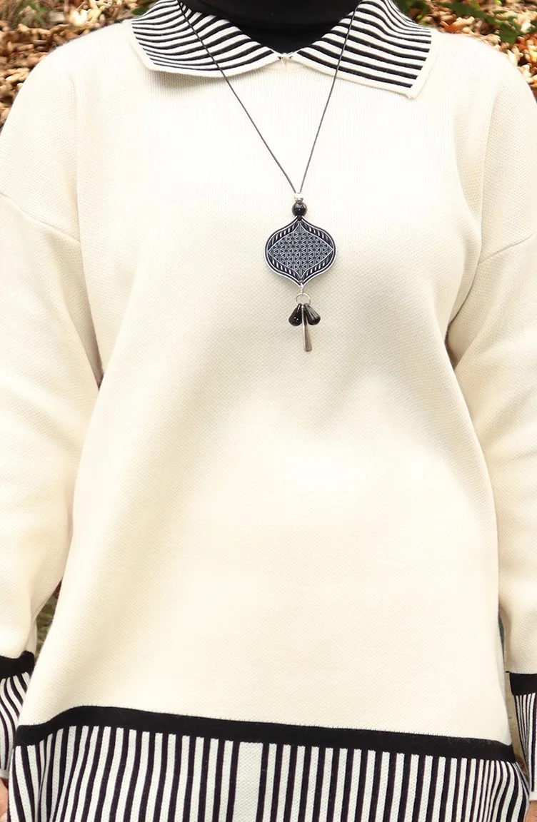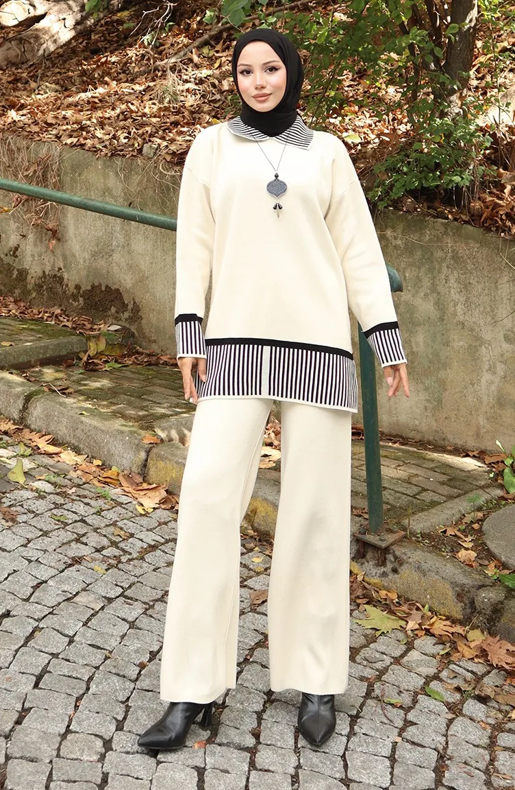 Ensemble Deux Pièces Tunique Et Pantalon à Rayures En Tricot 1066-02 Beige 1066-02