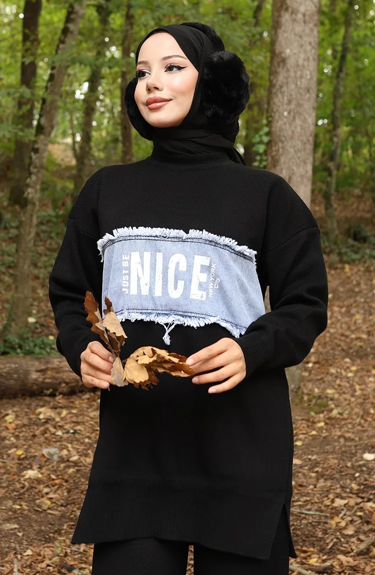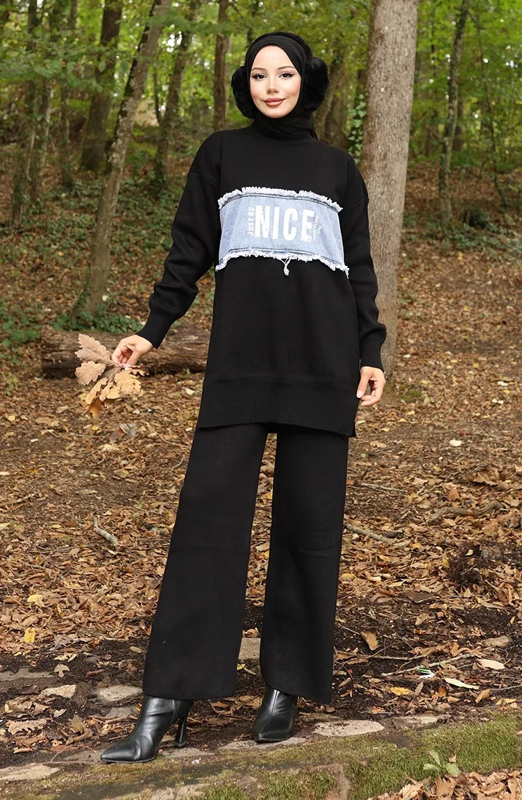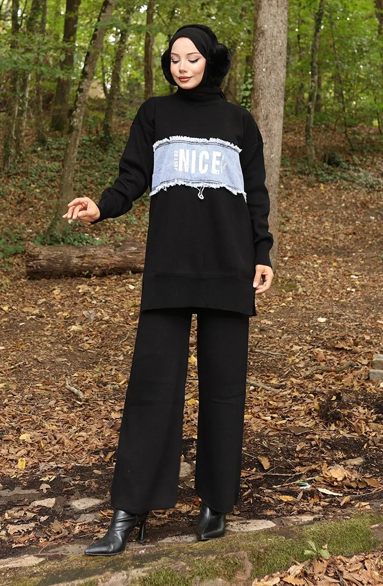 Ensemble Deux Pièces Tunique Et Pantalon En Denim Tricoté 1094-08 Noir 1094-08