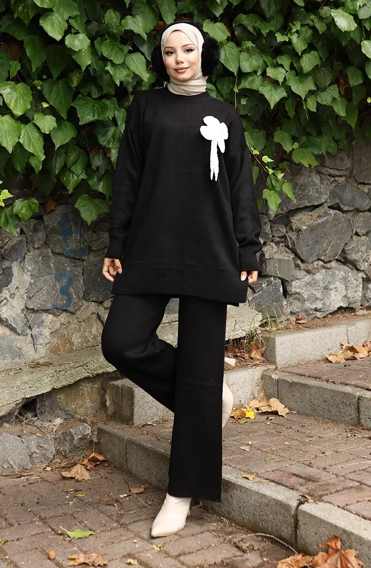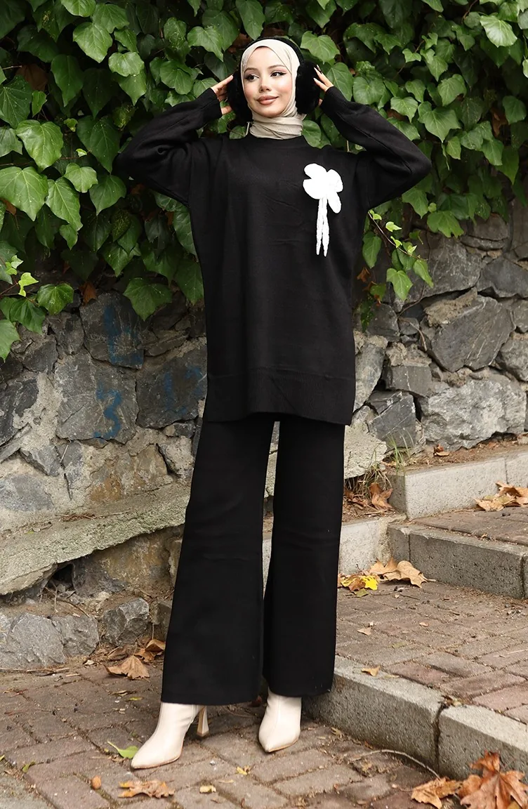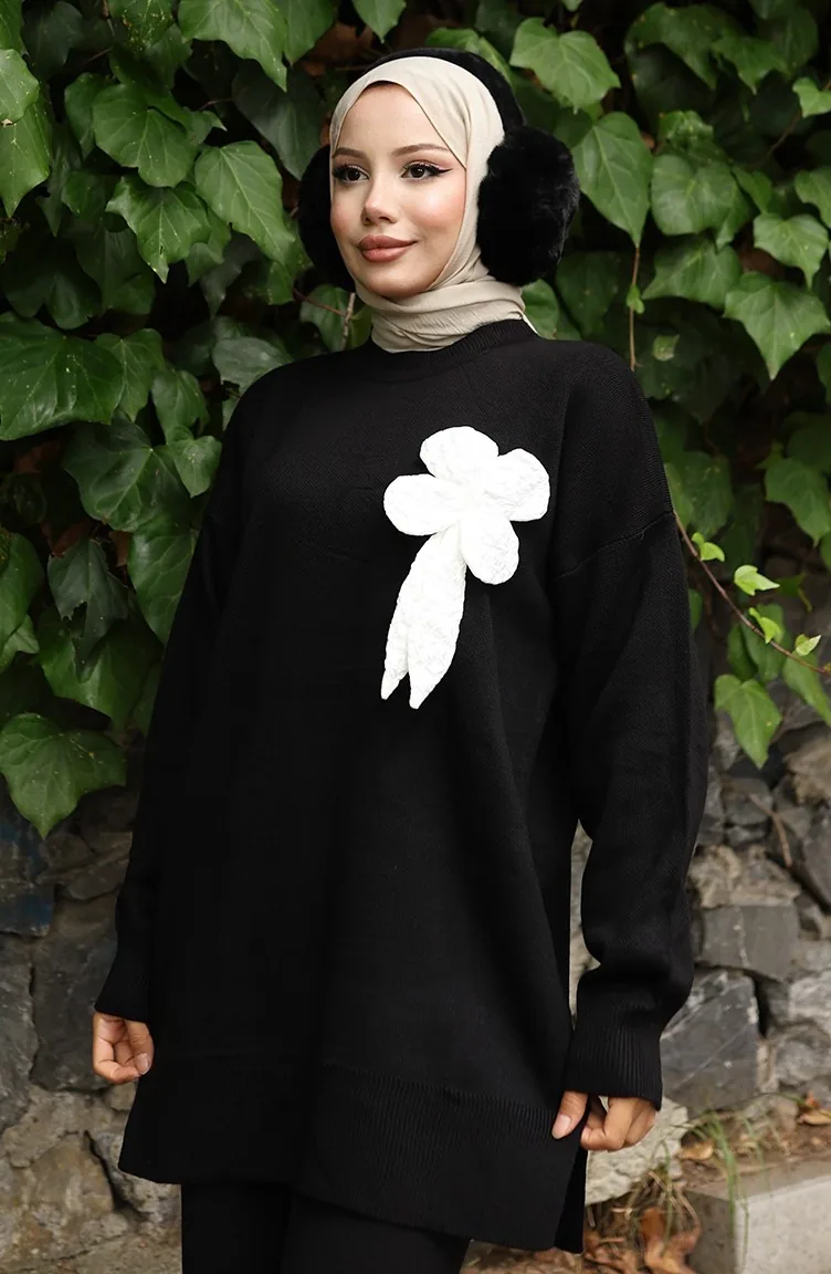 Ensemble Deux Pièces Tunique Et Pantalon En Tricot à Détails Floraux 1028-03 Noir 1028-03