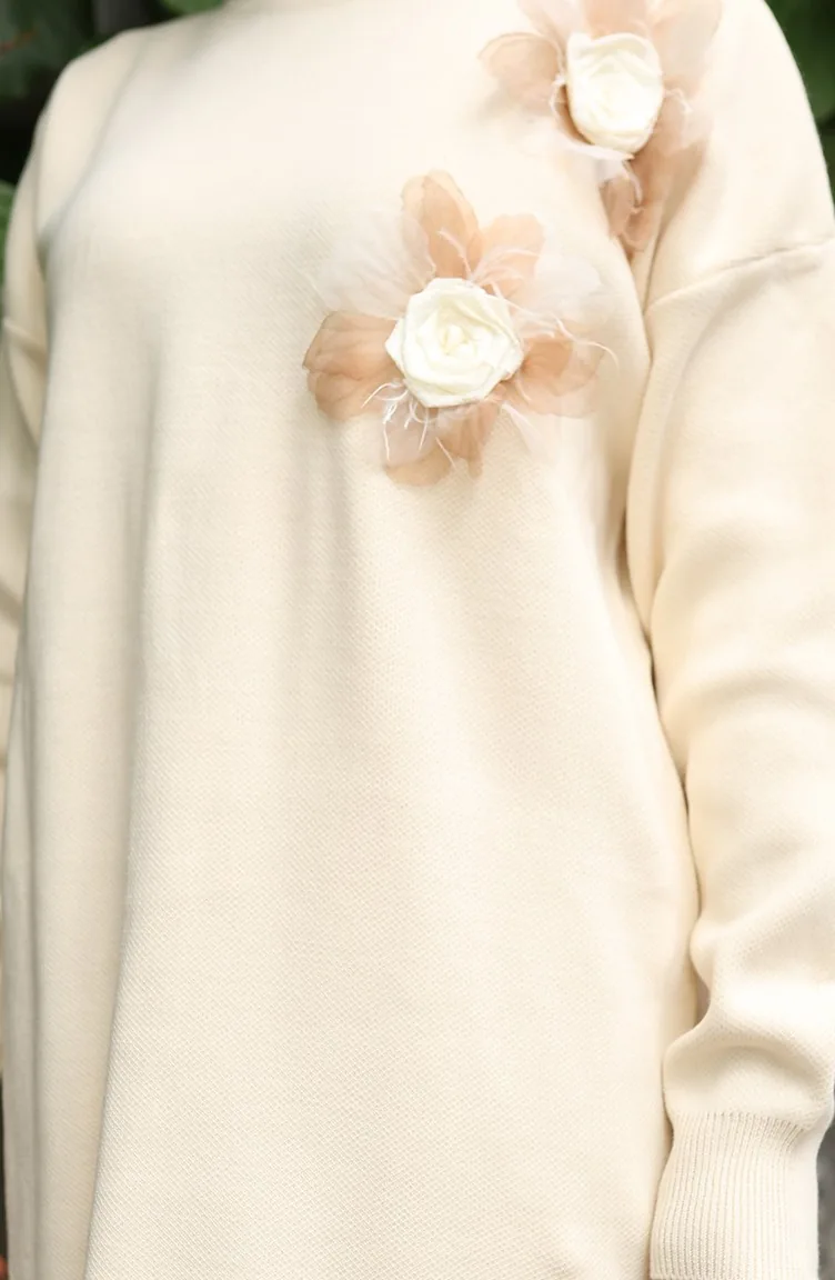 Ensemble Deux Pièces Tunique Et Pantalon En Tricot Avec Appliqués Roses 1036-04 Beige 1036-04