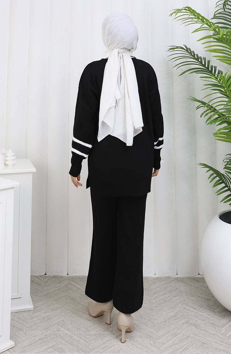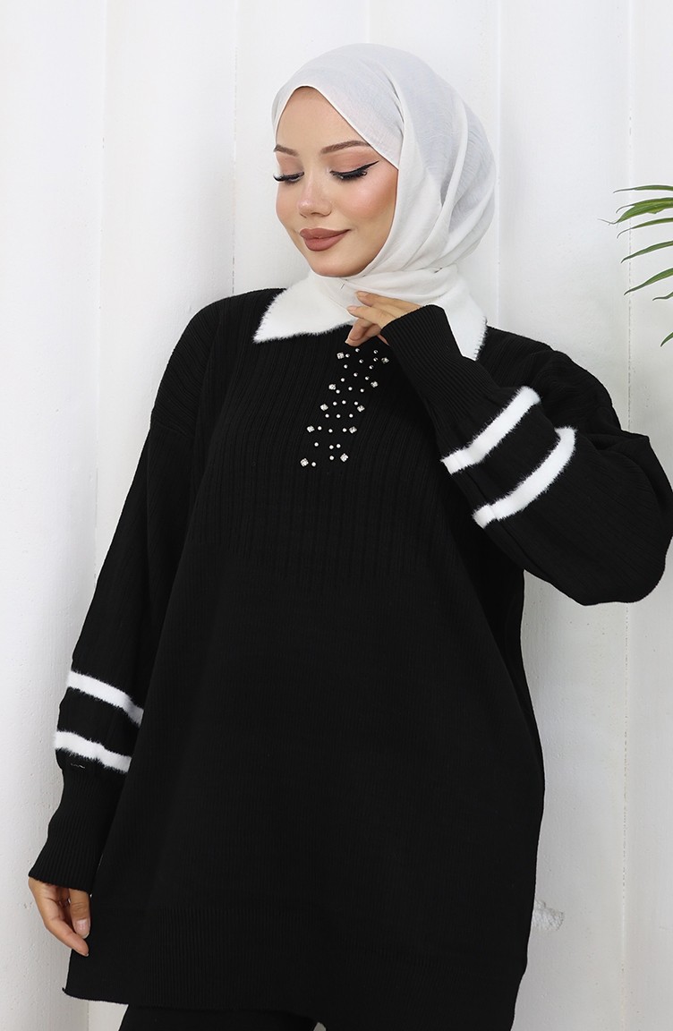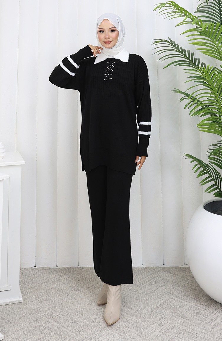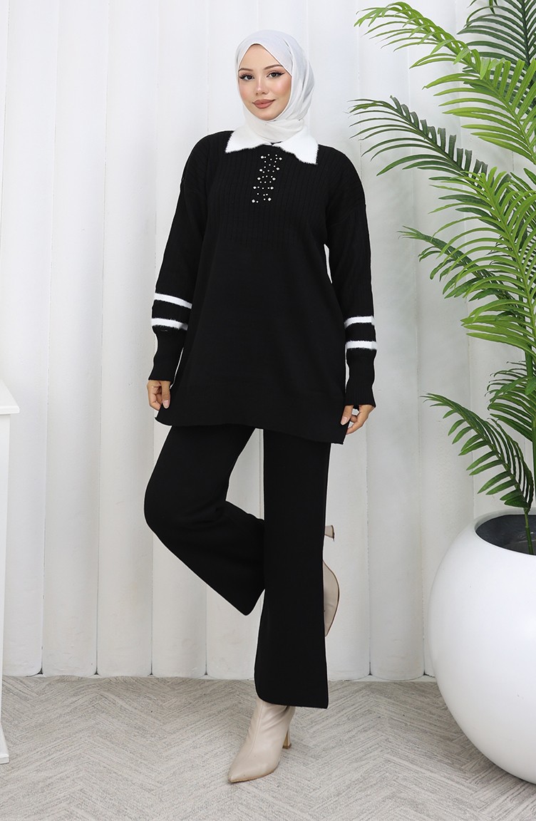 Ensemble Deux Pièces Tunique Et Pantalon En Tricot Avec Col Détaillé 1002-01 Noir 1002-01