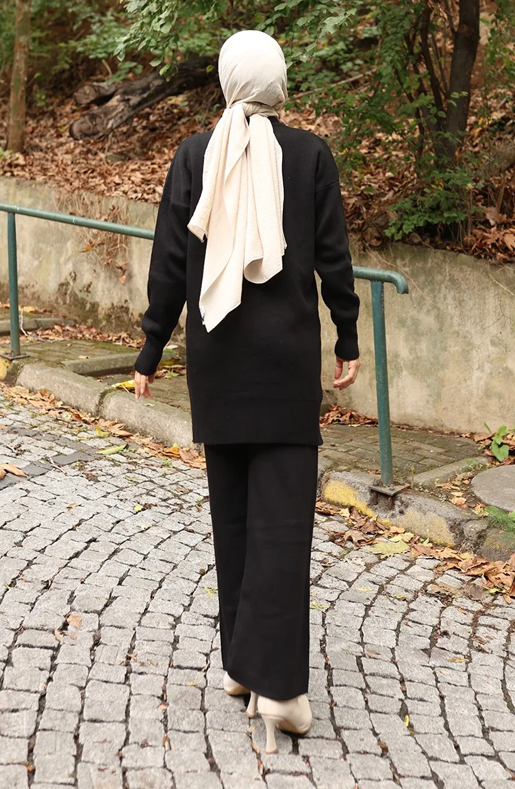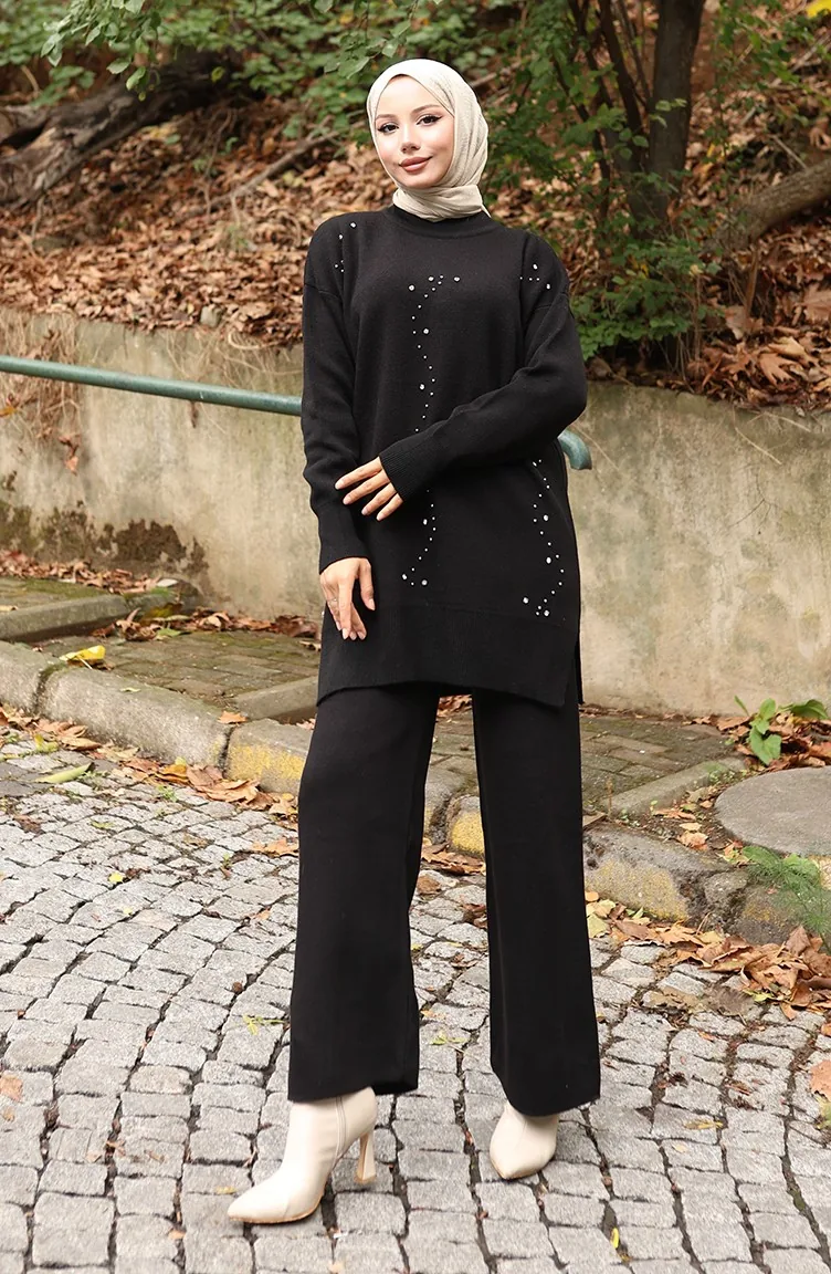 Ensemble Deux Pièces Tunique Et Pantalon En Tricot Imprimé Pierre 1104-01 Noir 1104-01