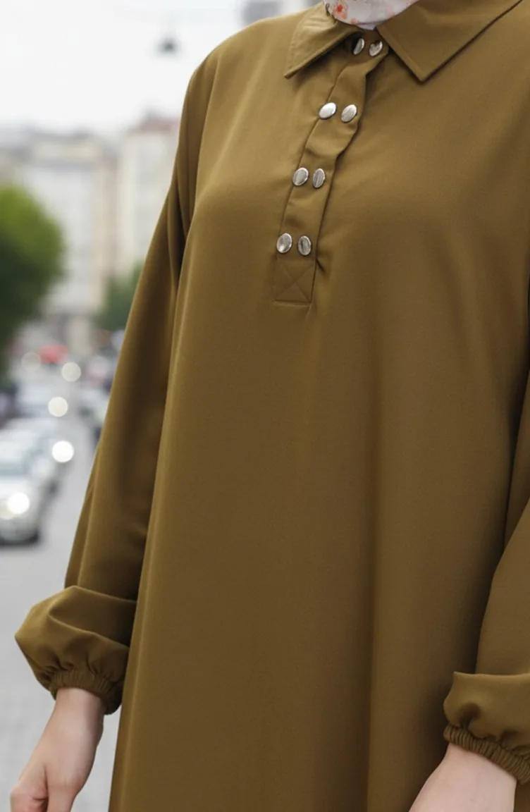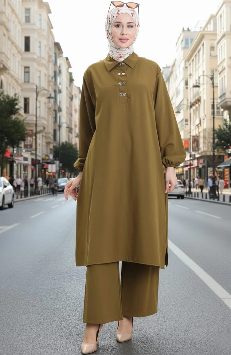 Ensemble Deux Pièces Tunique Et Pantalon à Col Chemise Vert Olive 0123-04 0123-04
