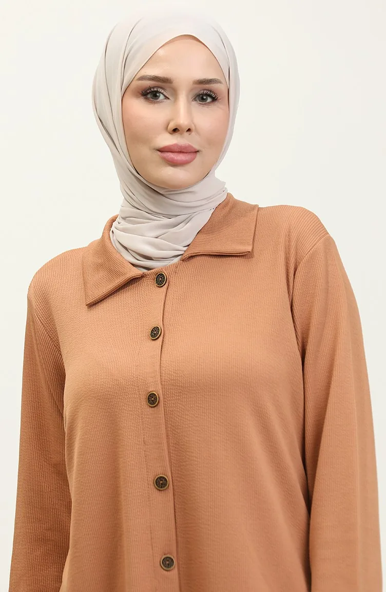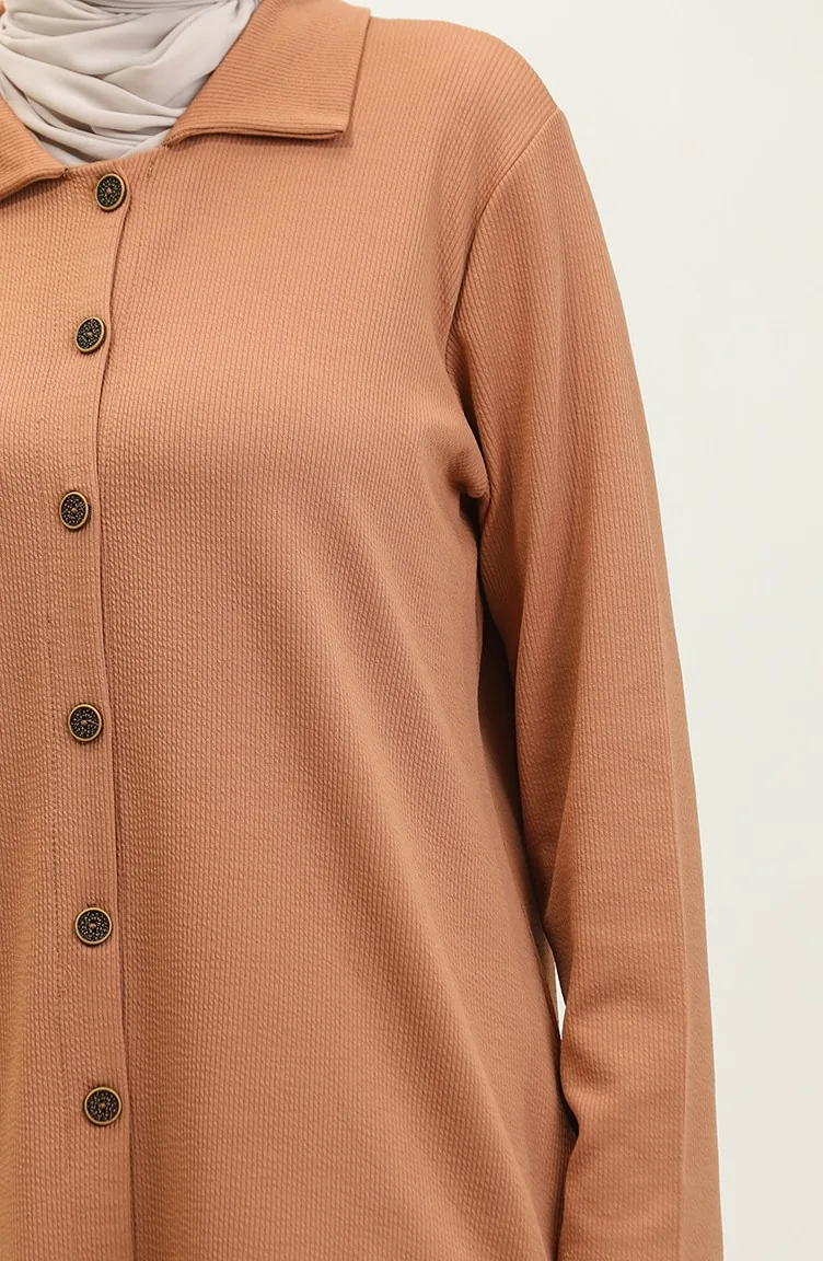 Couleur Biscuit. Tissu tricoté. Simple. Sans doublure. Manches longues. Col Chemise. Saisonnier. Femme. Option de grande taille disponible.