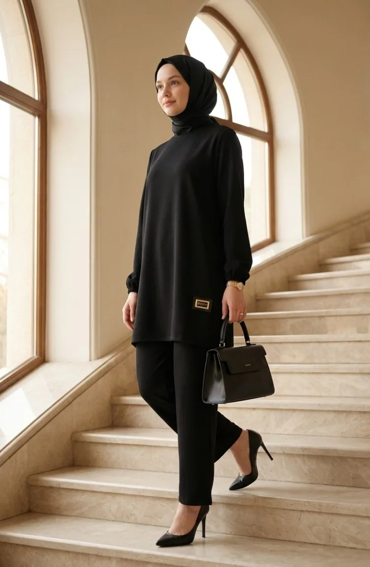 Ensemble Deux Pièces Tunique Et Pantalon Avec Emblème 0231-04 Noir 0231-04