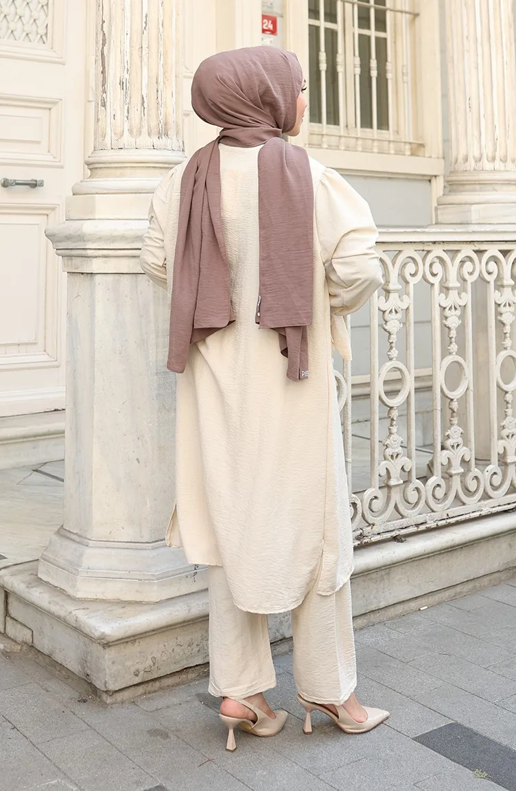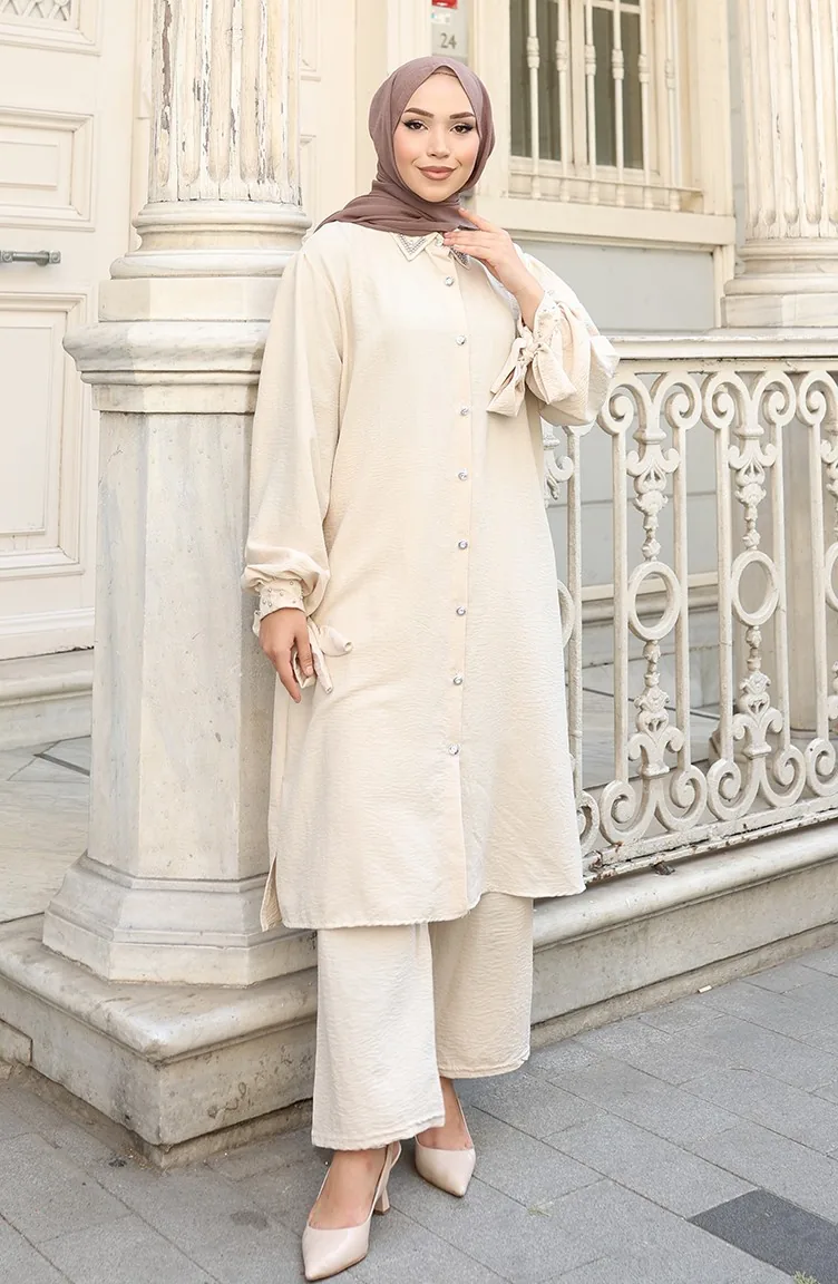 Ensemble Deux Pièces Tunique Et Pantalon Boutonnés En Tissu Aerobin 2147-04 Beige 2147-04