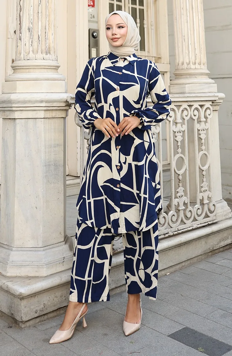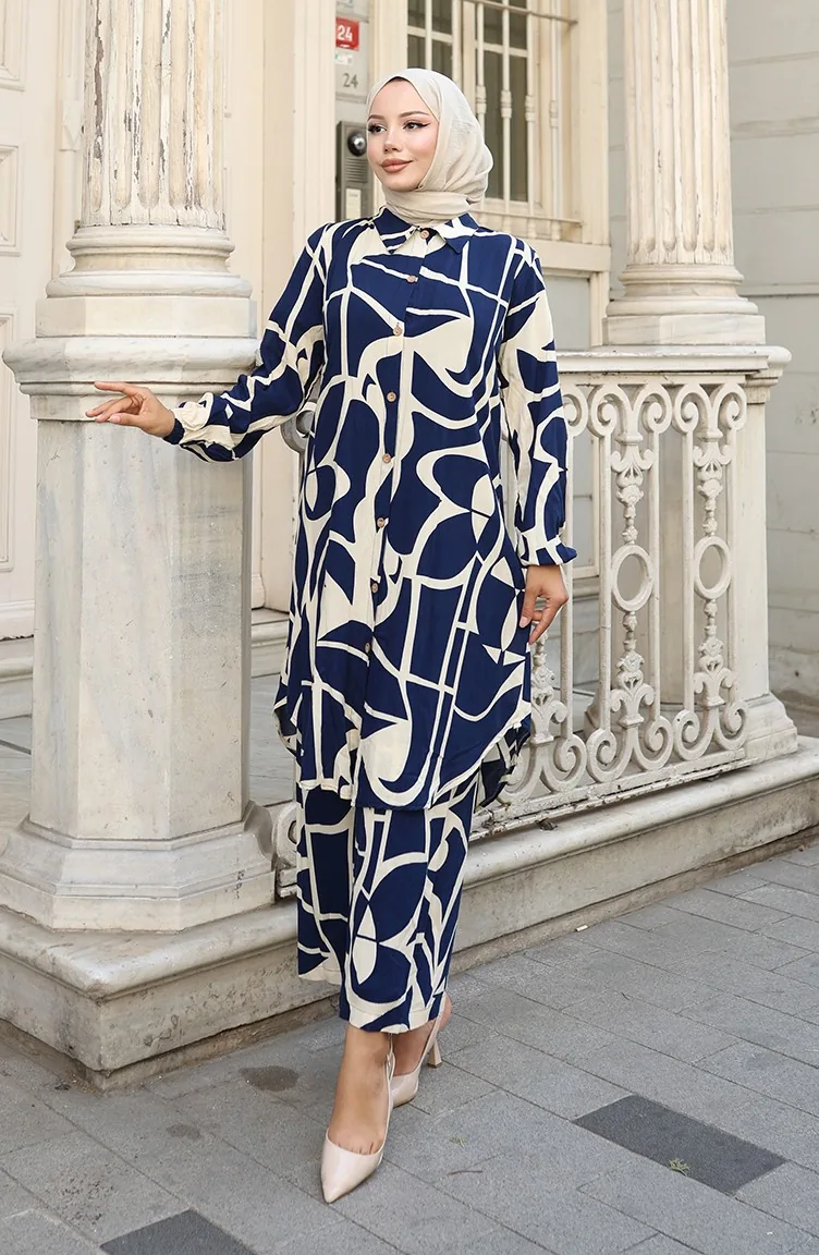 Ensemble Deux Pièces Tunique Et Pantalon En Viscose 0143-01 Bleu Marine 0143-01