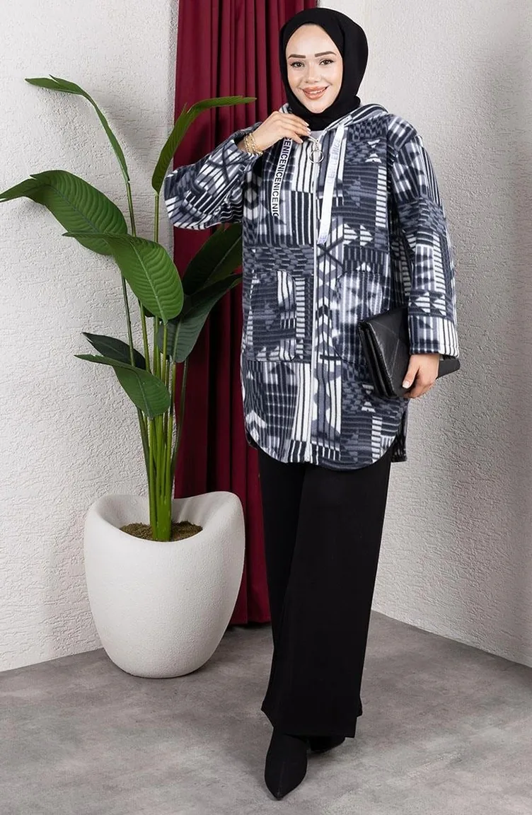 Gilet En Peluche à Capuche à Motifs 2062-04 Anthracite 2062-04