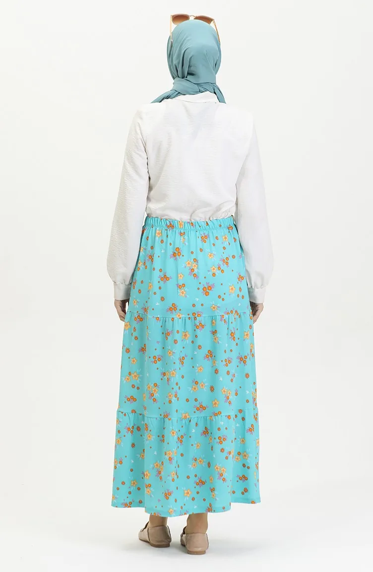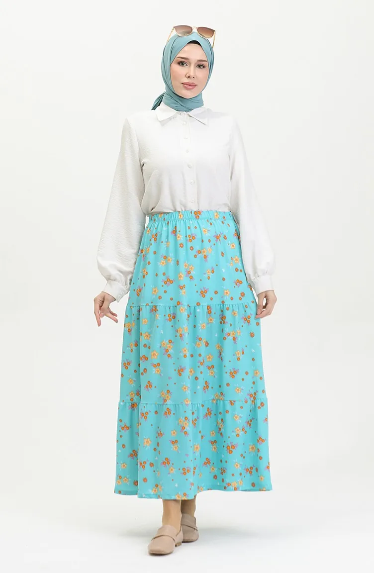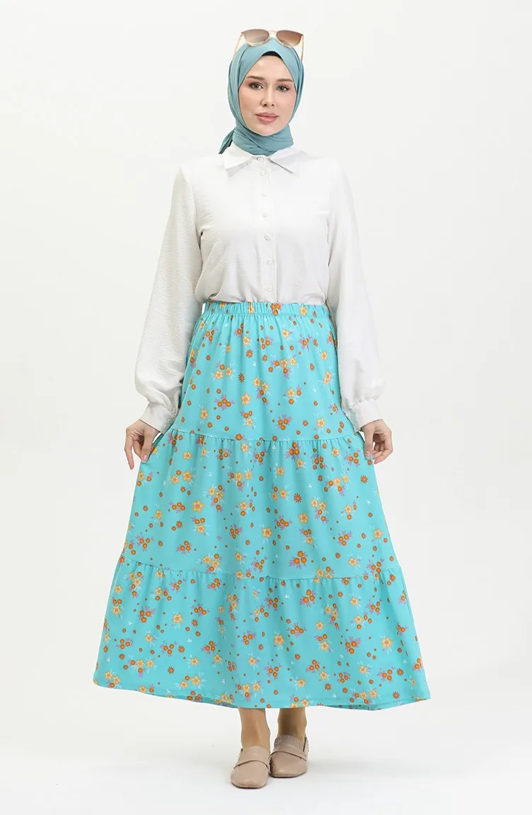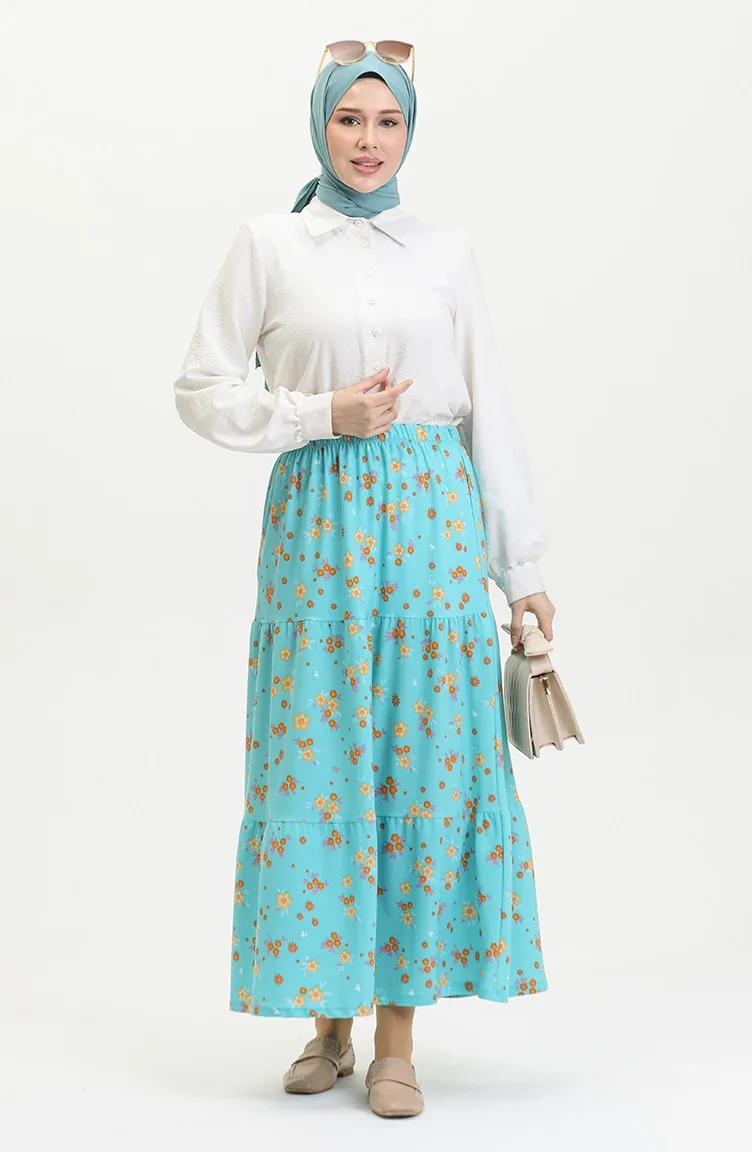 Jupe Longue Superposée En Crêpe à Motifs Floraux 8718-01 Bleu Menthe 8718-01