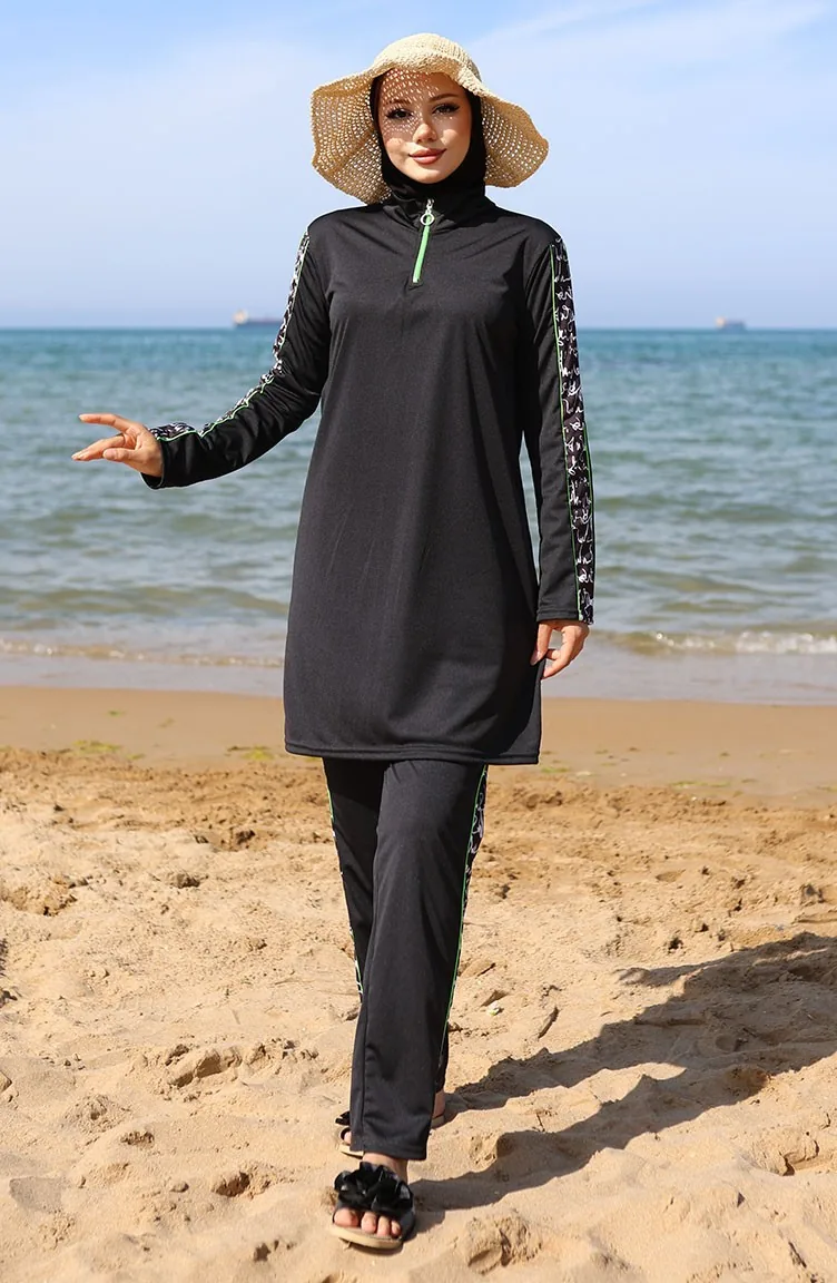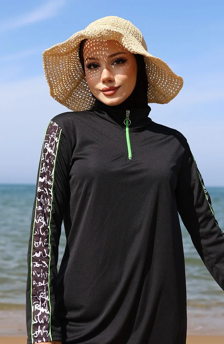 Maillot De Bain Hijab Zippé 2503-01 Noir Vert 2503-01