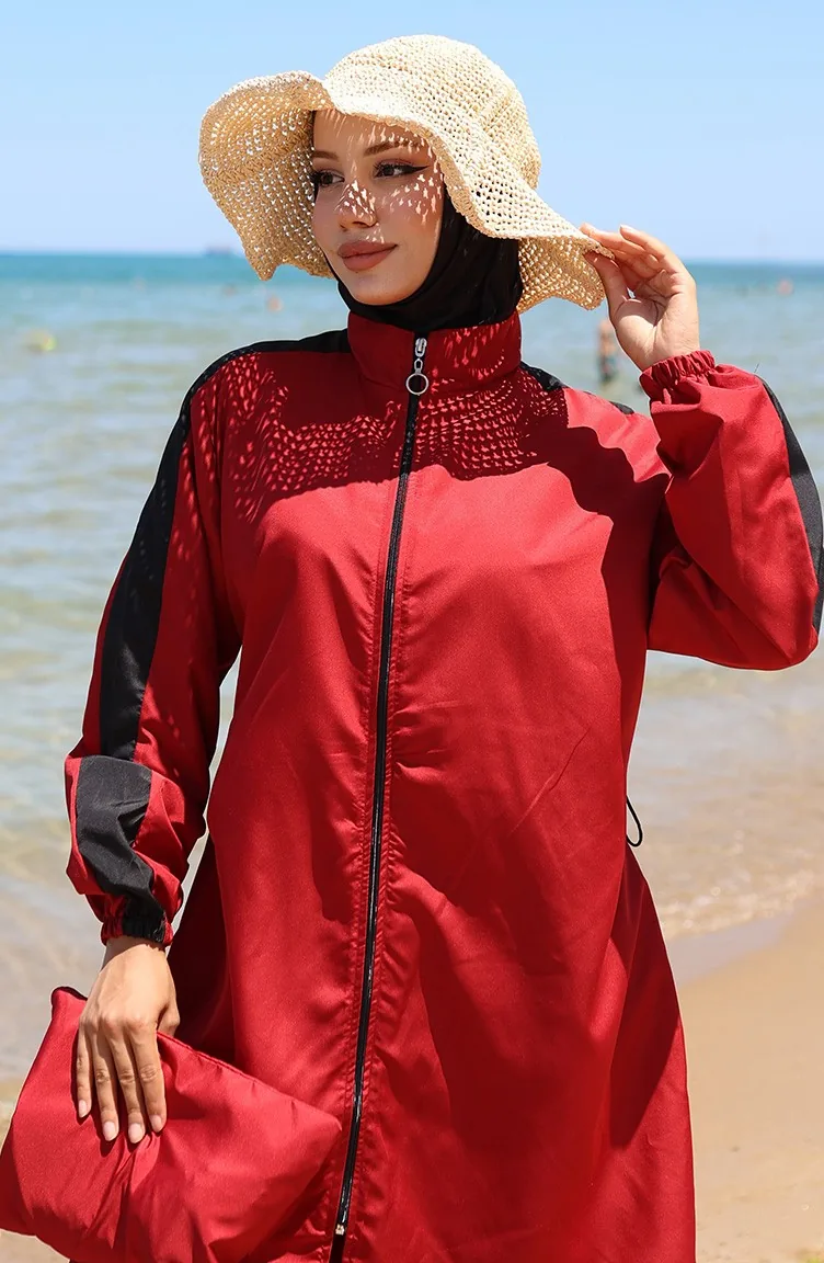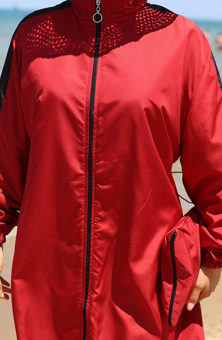 Maillot De Bain Modeste à Fermeture éclair Garni 6565-05 Rouge Bordeaux 6565-05