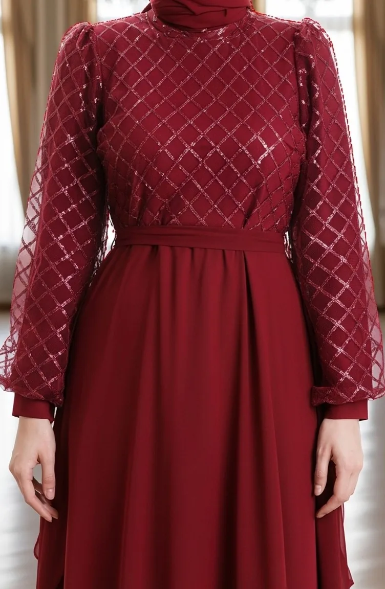 Robe De Soirée En Mousseline à Sequins Et Ceinture 5617-05 Bordeaux 5617-05