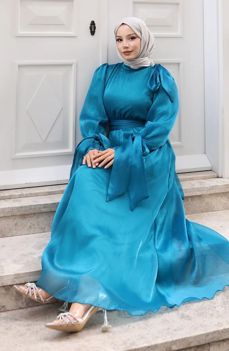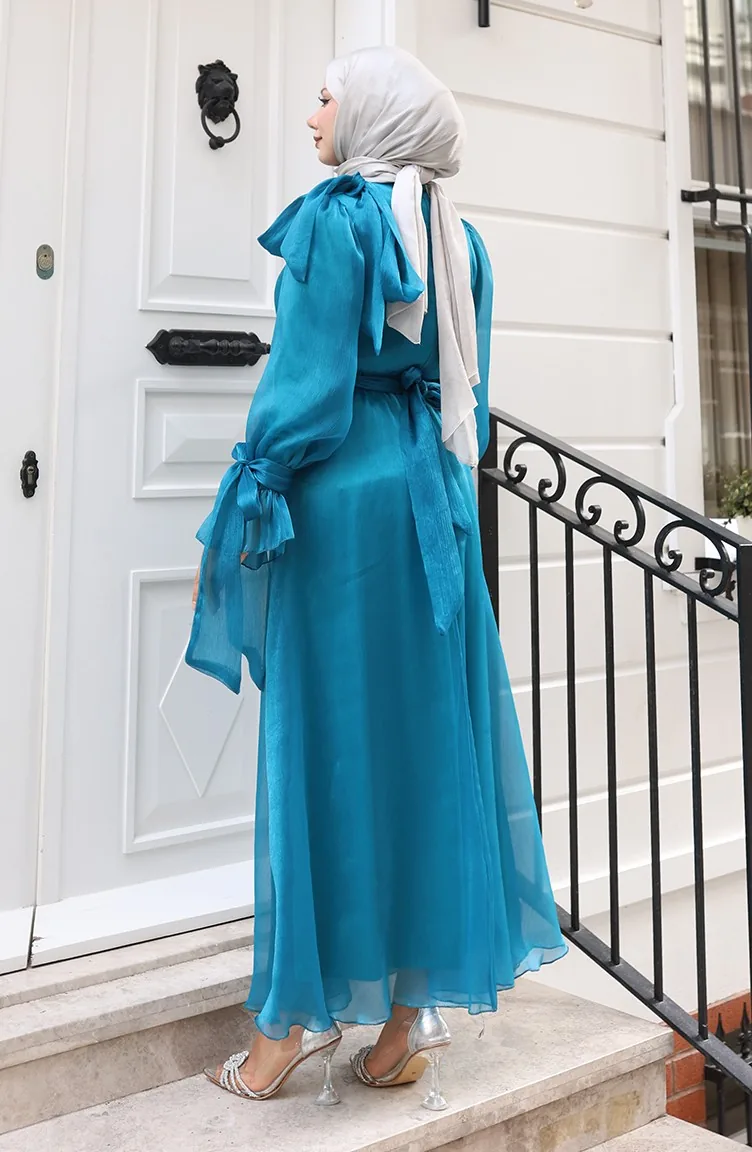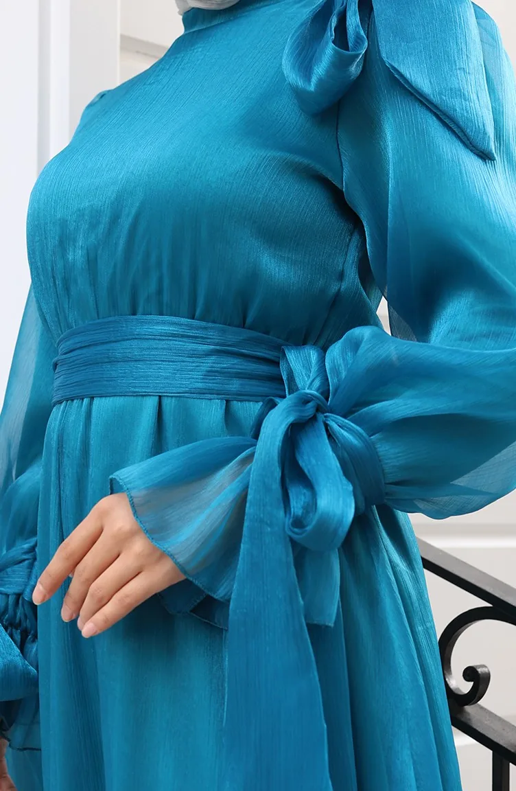 Robe De Soirée En Organza Et Tulle Plissée à La Taille Et Ceinturée Référence 5611-05 Pétrole 5611-05