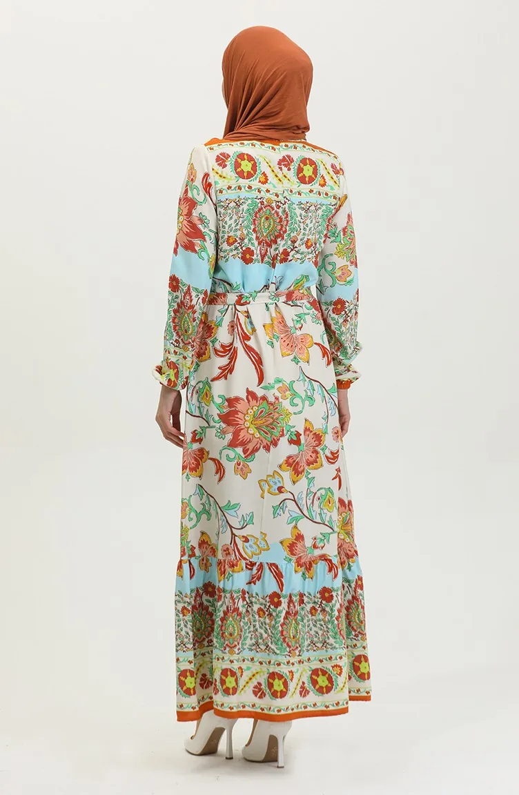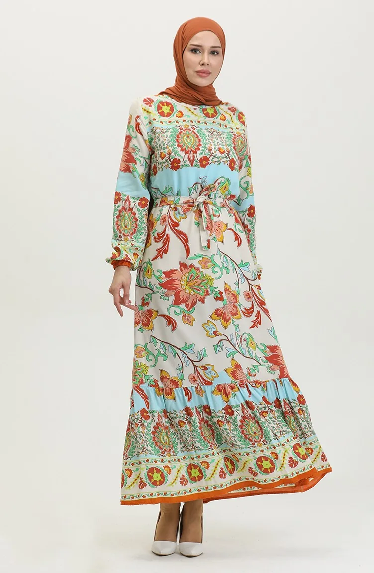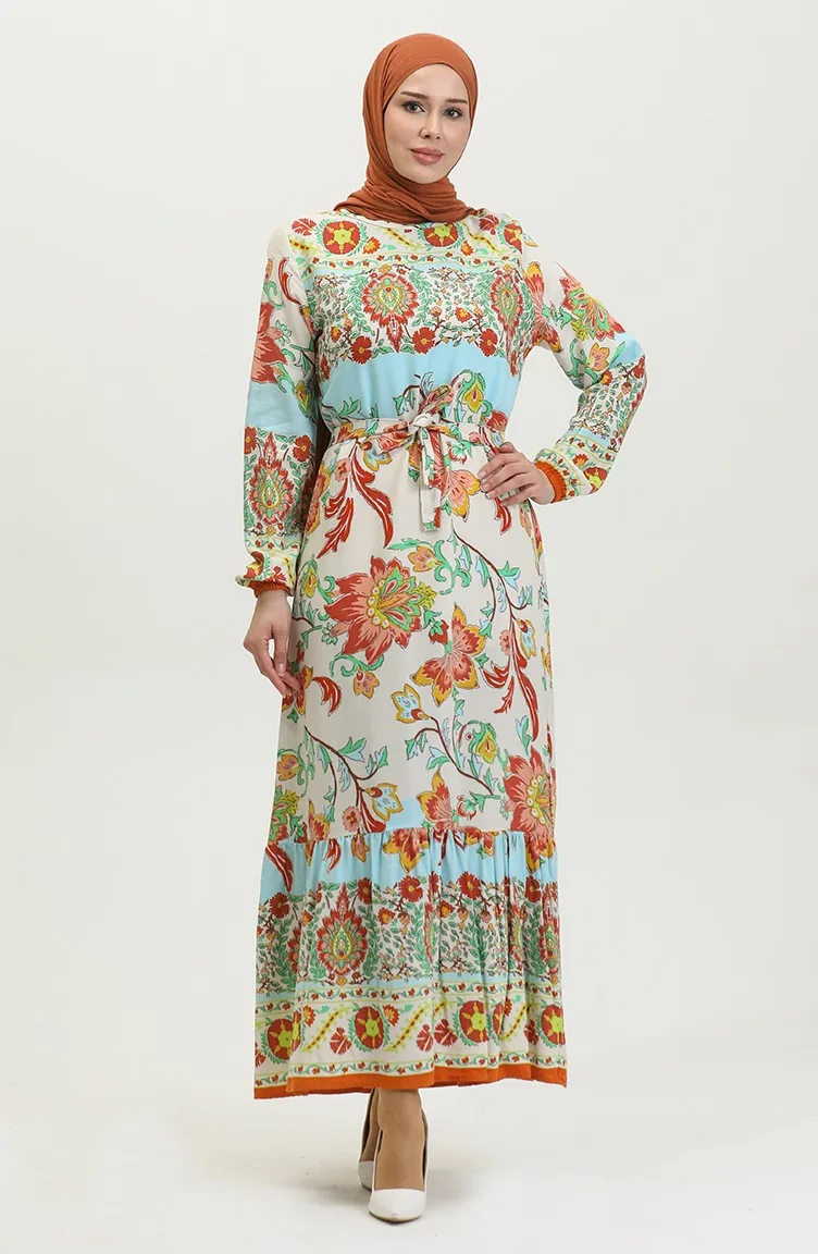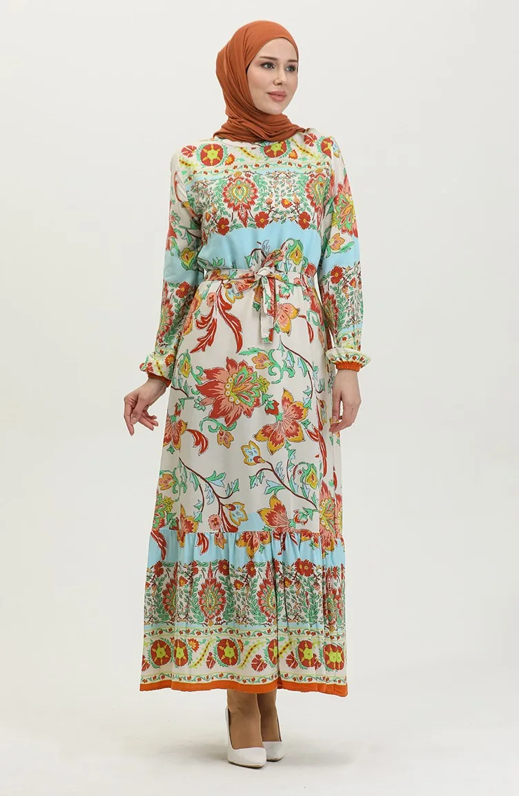 Alaçatı Robe Viscose Ceinturée Colorée à Motif 0384-02 Beige Moutarde 0384-02