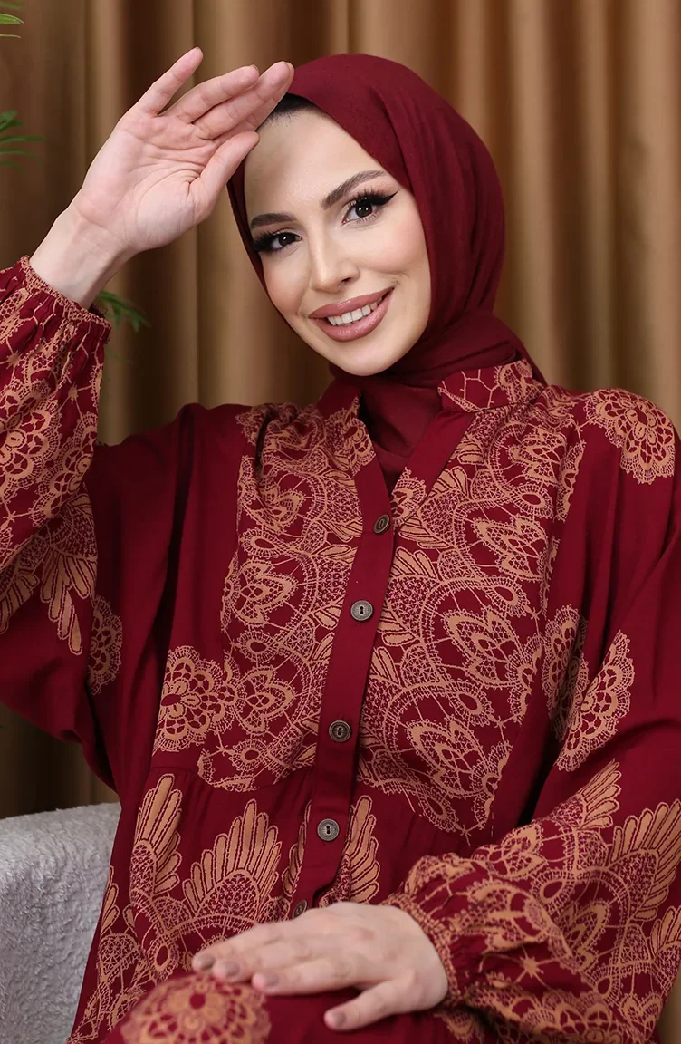 Robe à Manches Ballon Et Motif Carreaux 5575-04 Bordeaux 5575-04