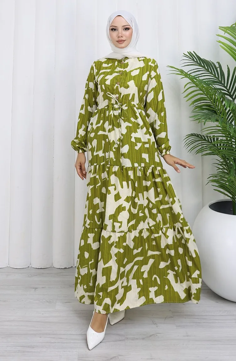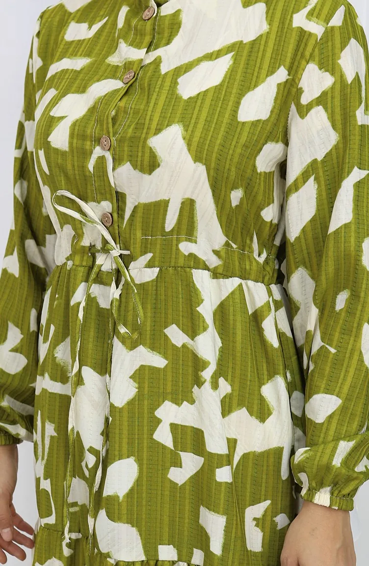 Robe à Motifs Avec Col Mandarin Et Taille Nouée 0191-04 Kaki 0191-04