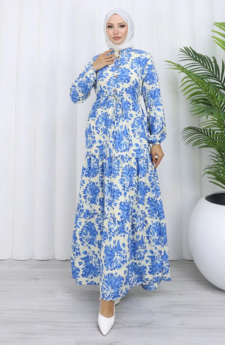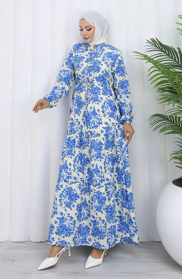 Robe à Motifs Avec Col Mandarin Et Taille Nouée 0192-02 Indigo 0192-02