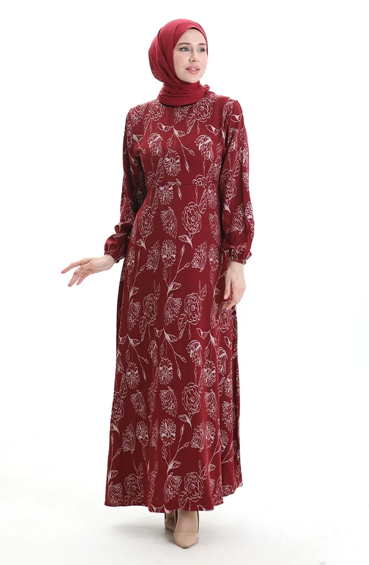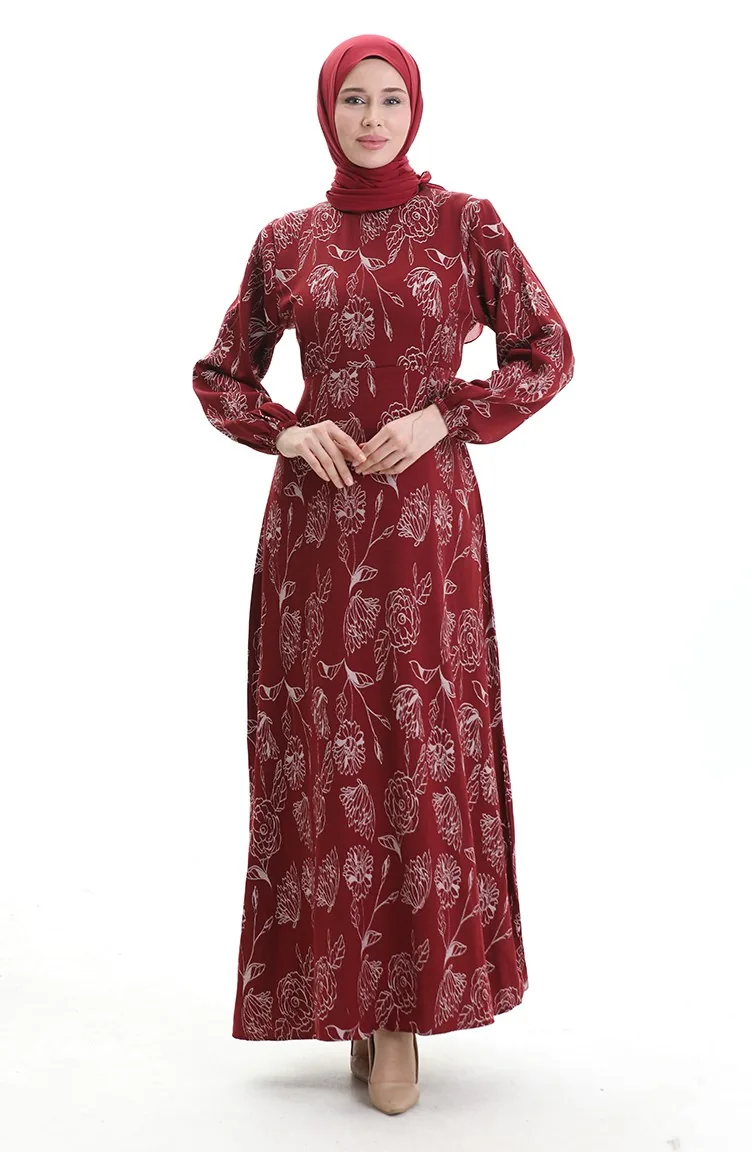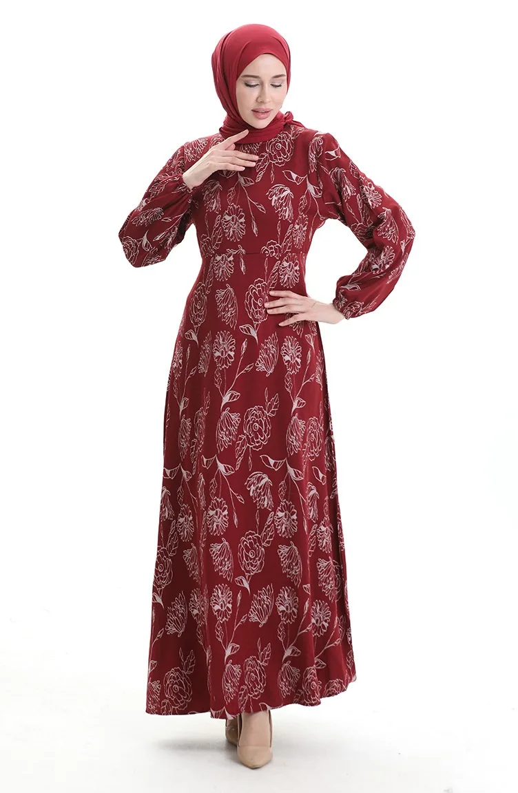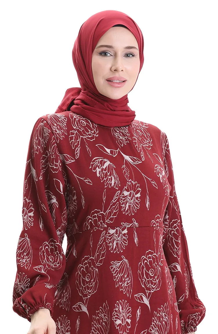 Robe à Motifs Avec Manches élastiques 2046-02 Rouge Bordeaux 2046-02