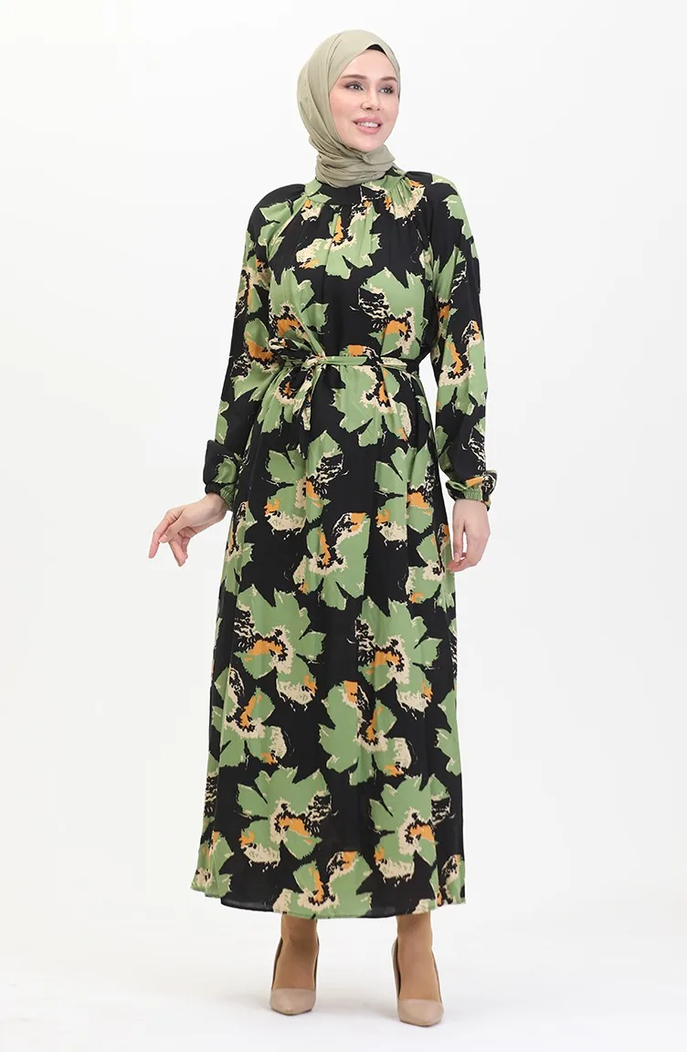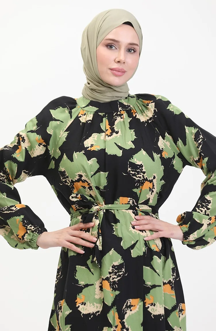 Robe A Motifs Ceinturée Manches Raglan 0476-02 Vert 0476-02