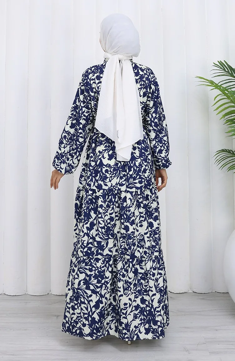 Robe à Motifs Col Mandarin Taille Nouée 0190-04 Bleu Marine 0190-04