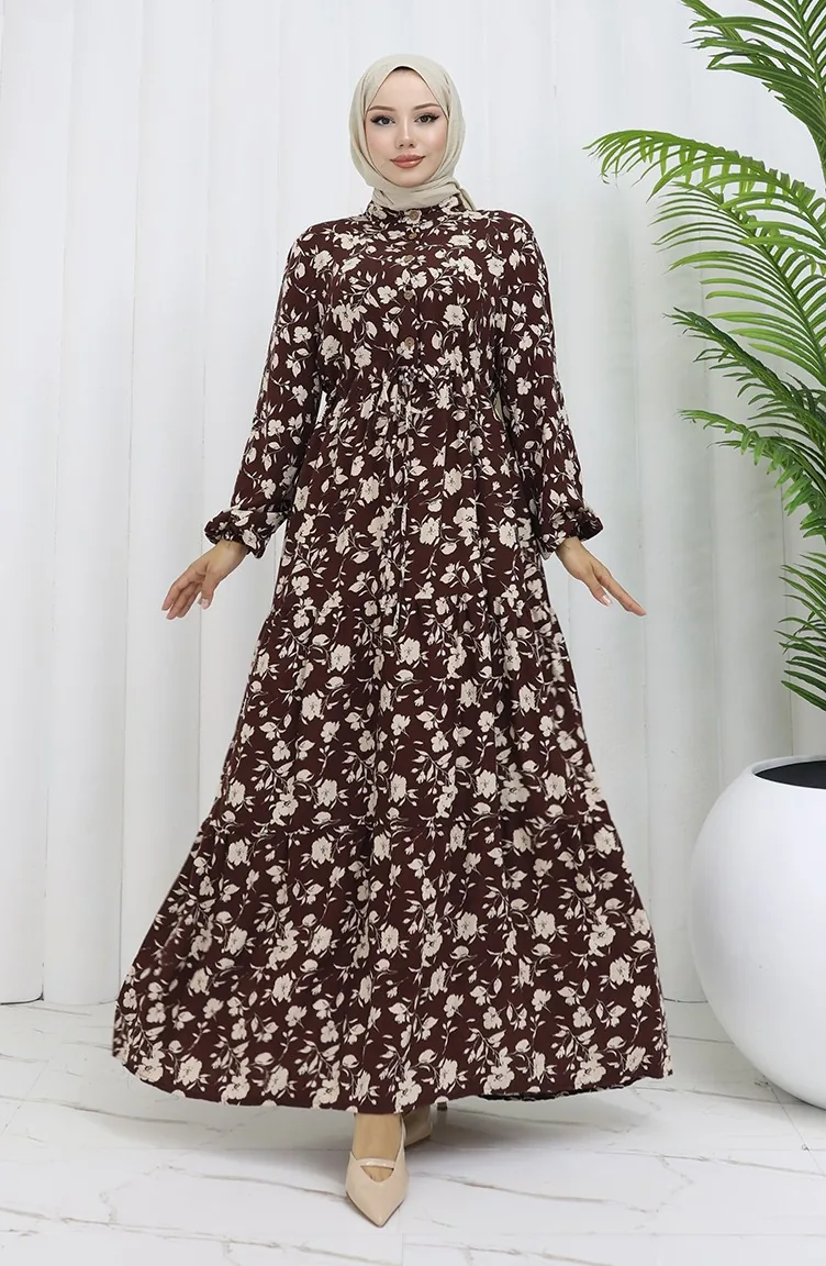 Robe à Motifs En Tissu Viscose à Demi-boutonnage 0053-01 Marron 0053-01