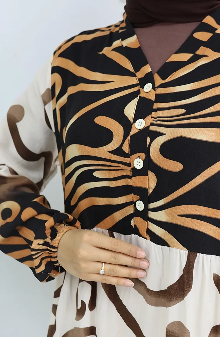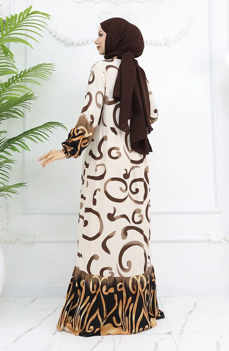Robe à Motifs En Viscose à Demi-bouton 0028-05 Marron Beige 0028-05