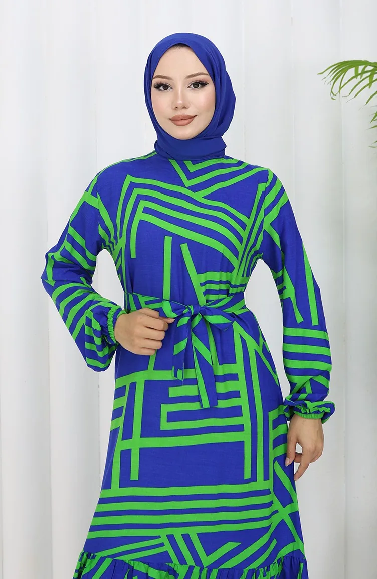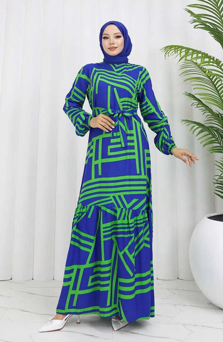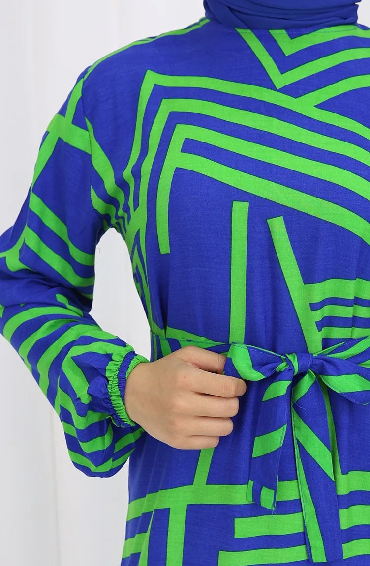 Robe A Motifs Et Ceinture 0459-01 Bleu Foncé Vert 0459-01