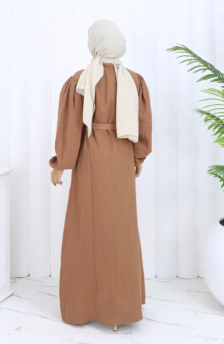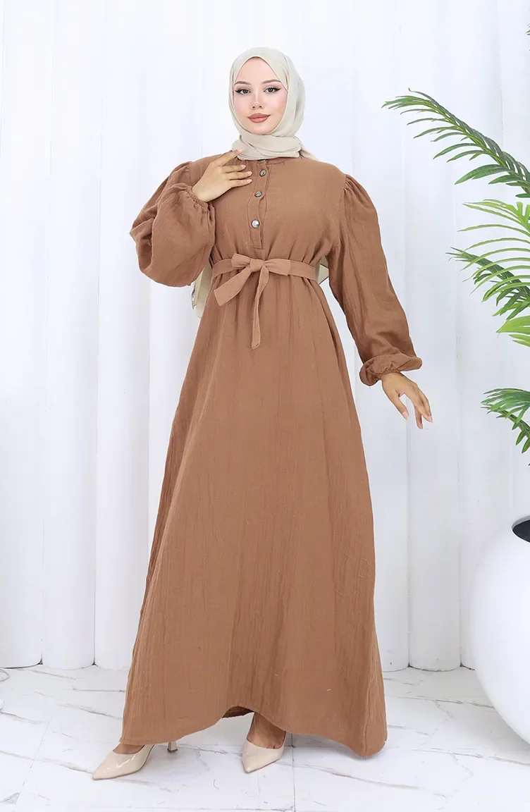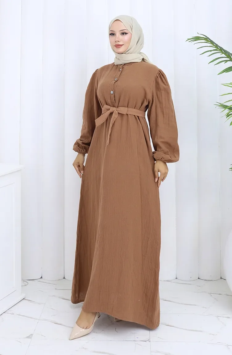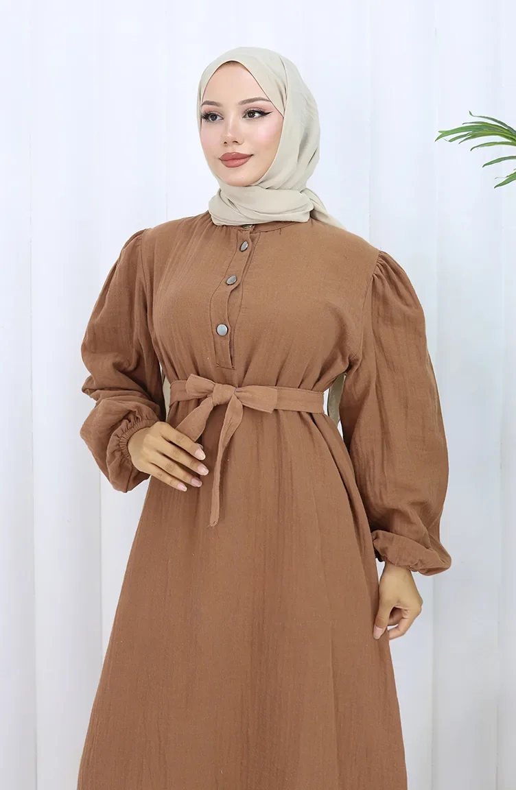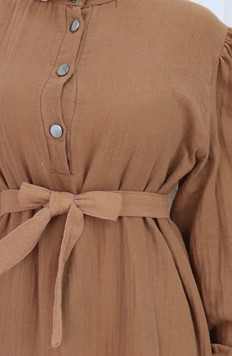 Robe Ceinturée à Manches élastiquées 2112-01 Marron 2112-01