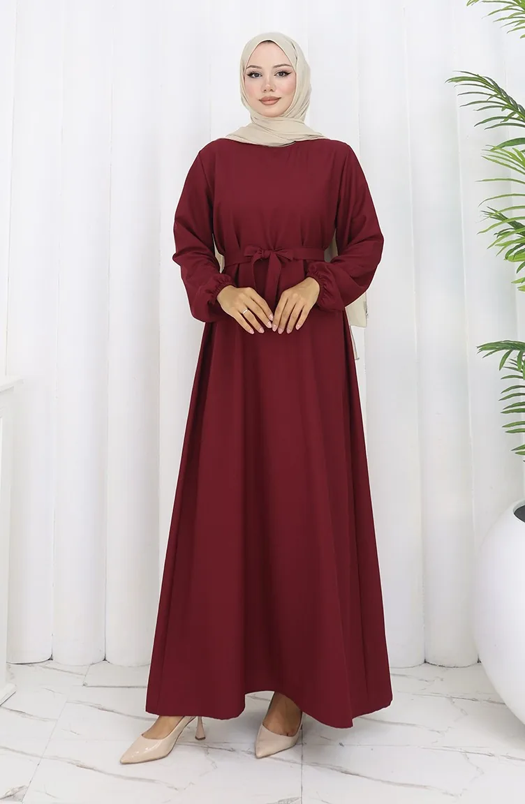 Robe Ceinturée à Manches élastiquées 2151-04 Rouge Bordeaux 2151-04