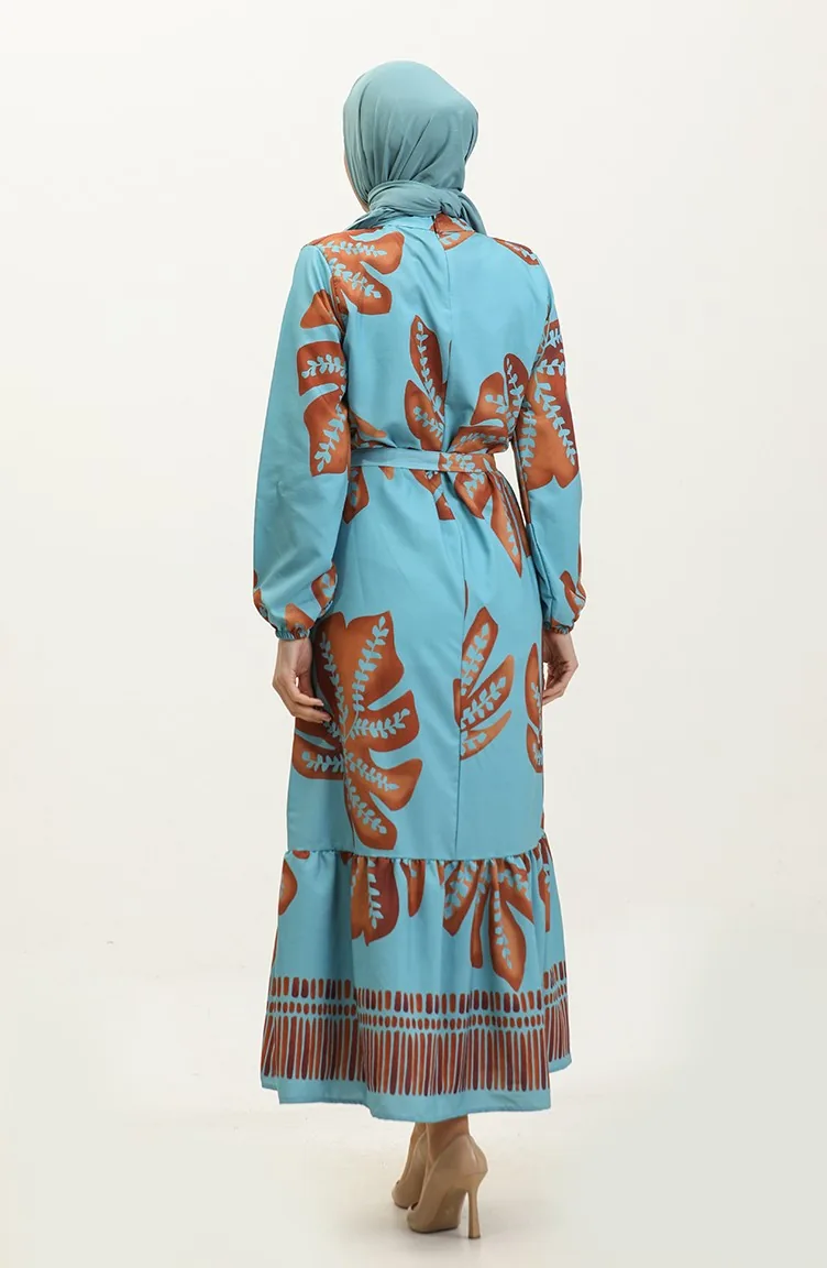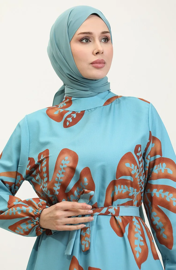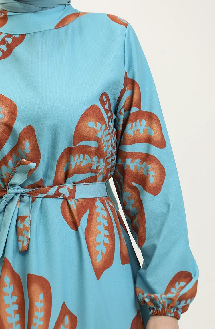 Robe Crepe A Motifs Fleuris 0350A-02 Bleu Menthe Marron 0350A-02