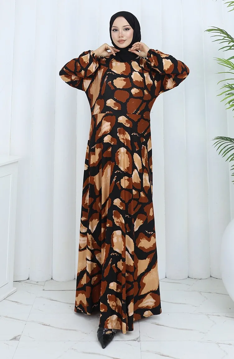 Robe En Coton Peigné à Motifs 2136-01 Marron Noir 2136-01