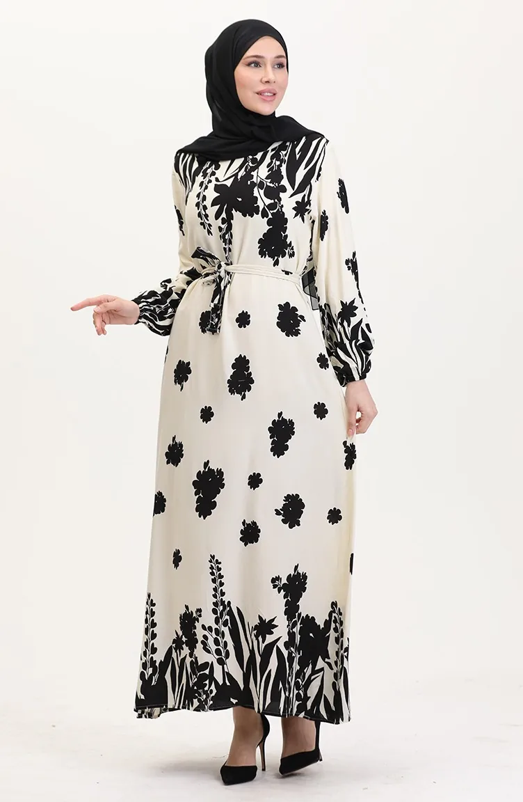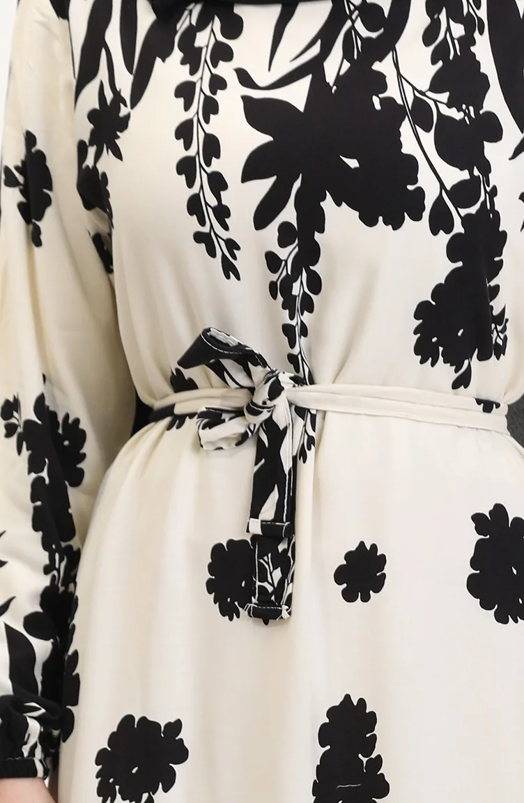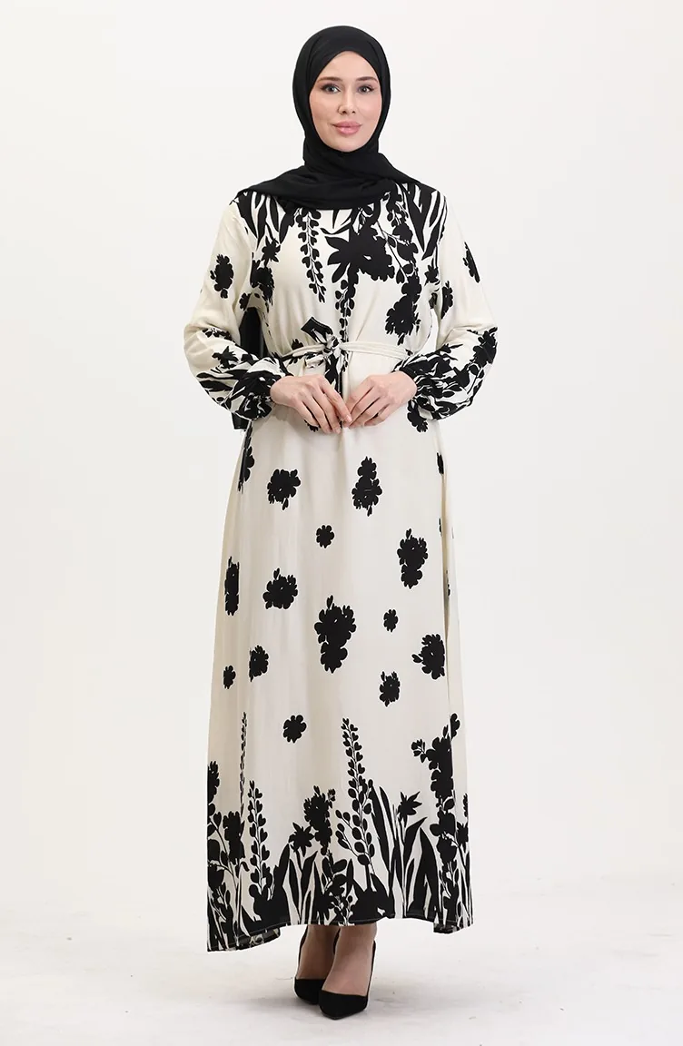 Robe En Viscose à Motifs Avec Ceinture 0018-05 Crème Noir 0018-05