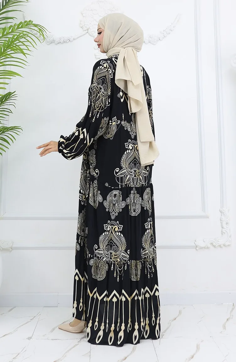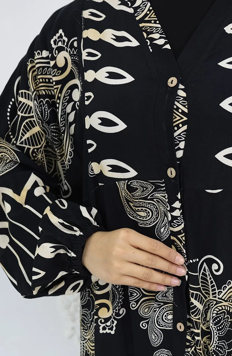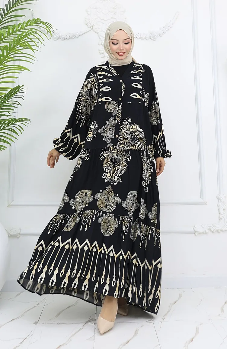 Robe En Viscose à Motifs Et Demi-boutonnée Alaçatı 0040-03 Noir 0040-03