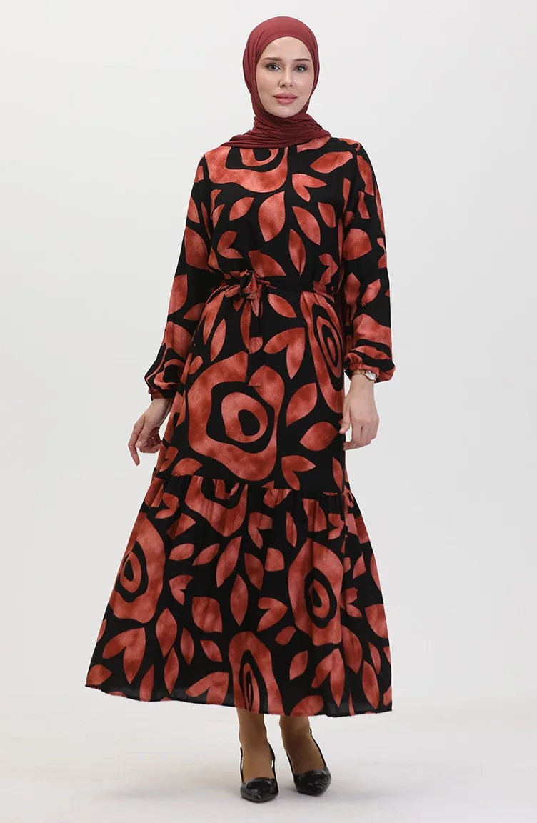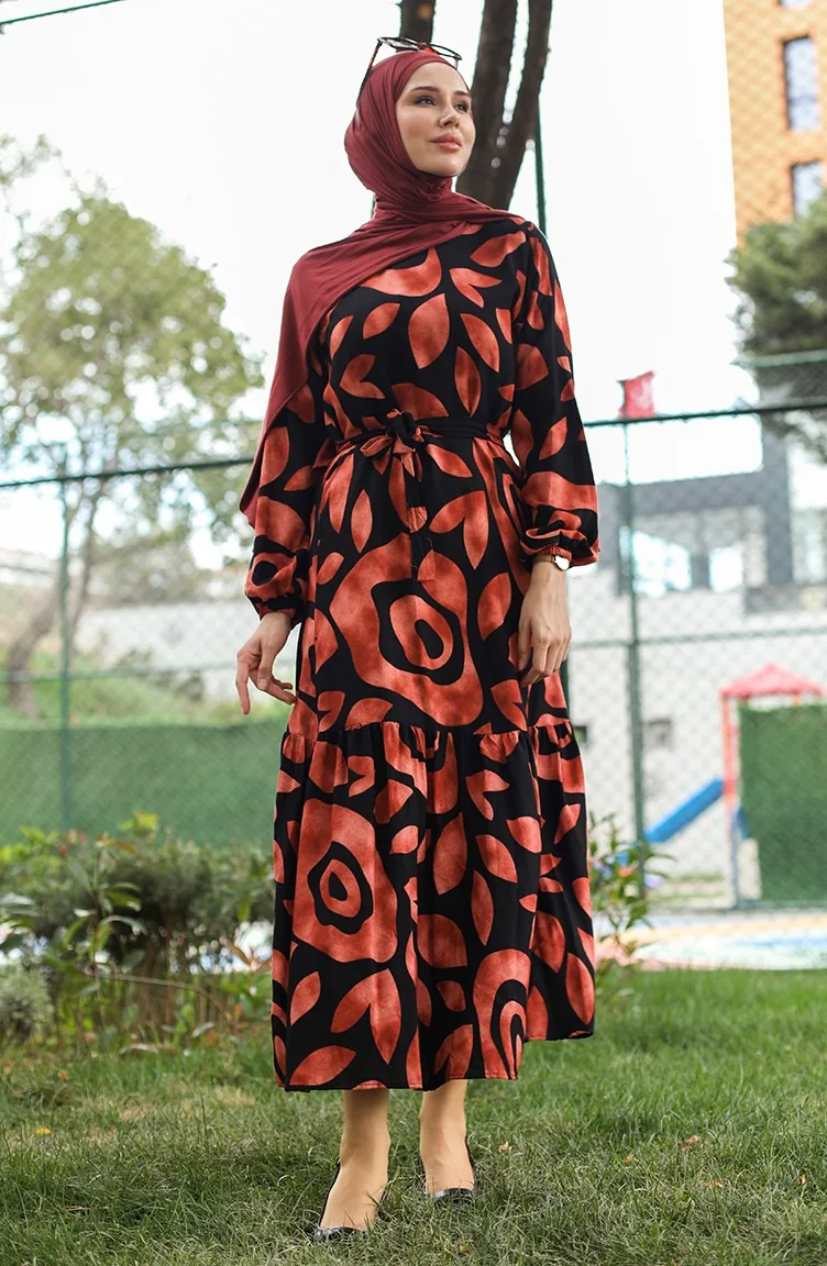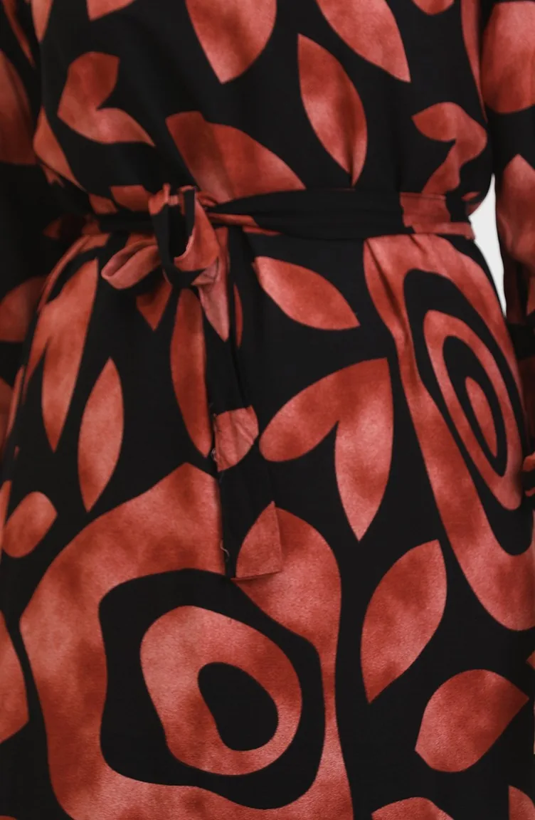 Couleur Brique. Viscose est un type de tissu synthétique et est pratique à utiliser. Tissu à motifs. A Ceinture. Manches élastiques. Col Zéro. Adapté pour les 4 saisons. Option de grande taille disponible.
