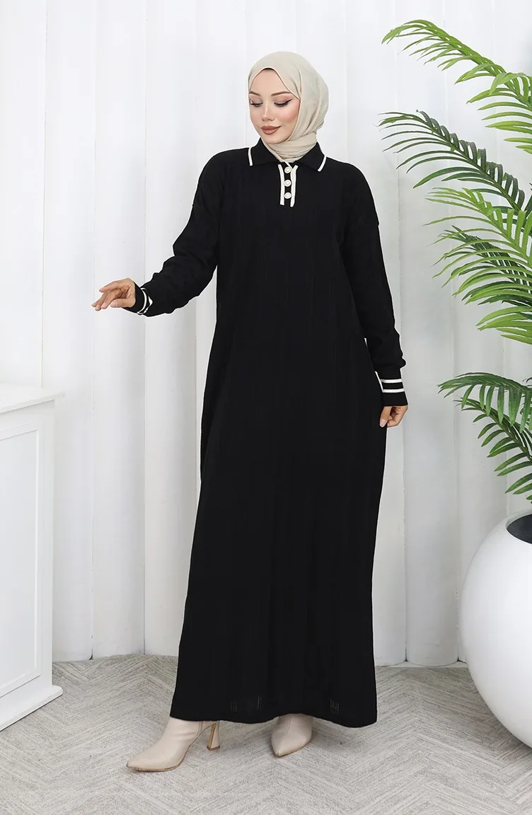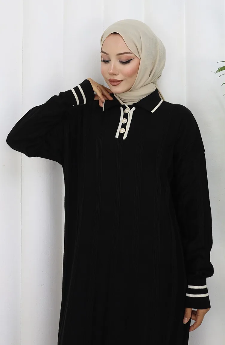 Robe Boutonnée à Col Polo En Maille 1135-07 Noir 1135-07
