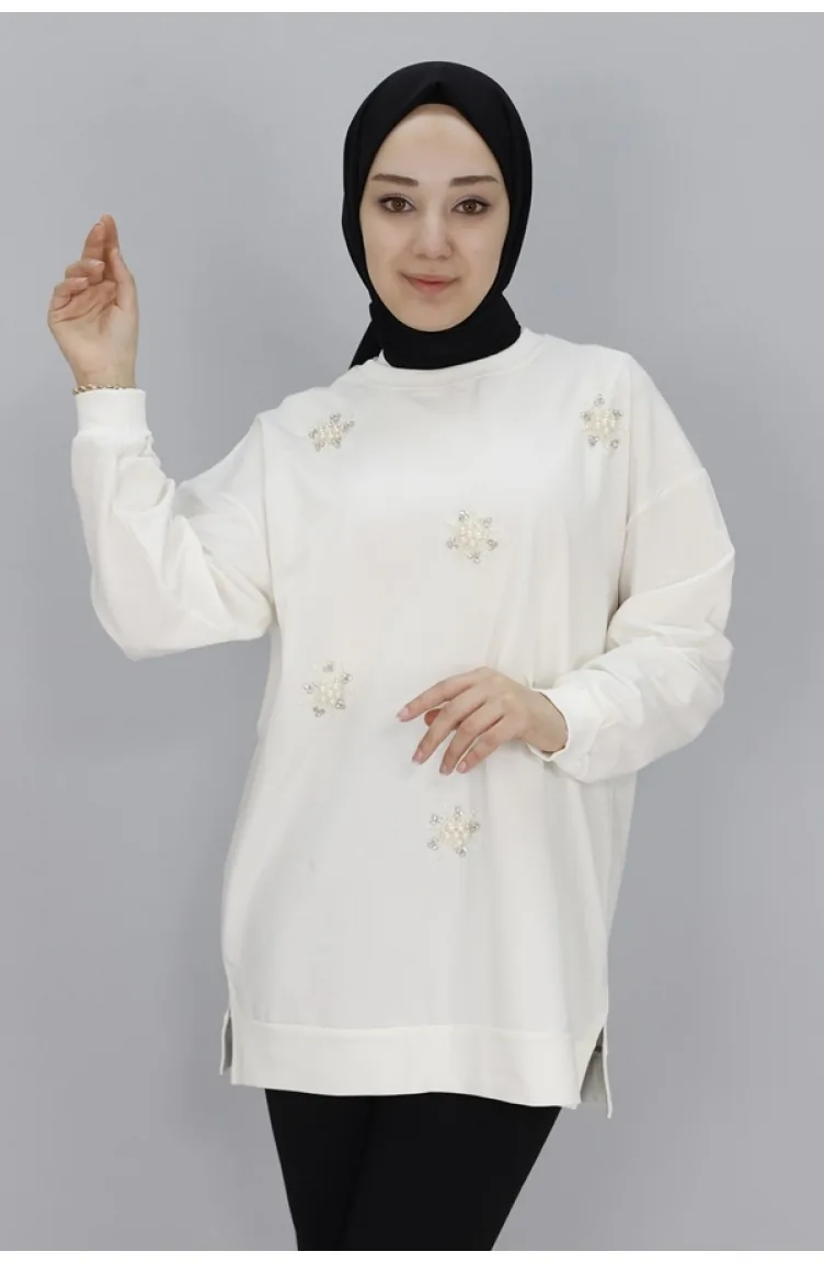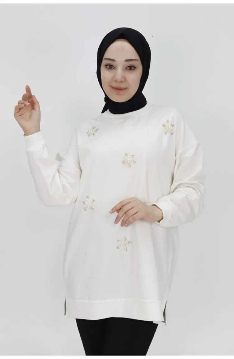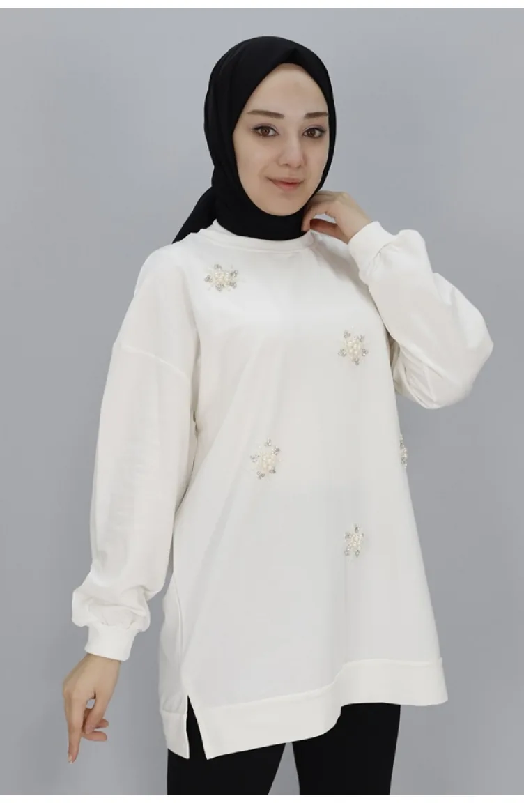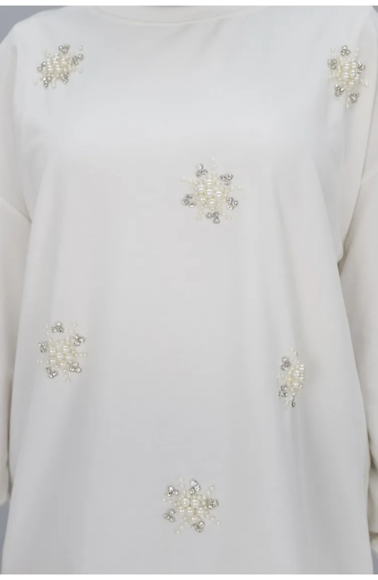 Sweat Tissu à 2 Cordons Détail Pierre Et Perle 20001-02 Ecru 20001-02