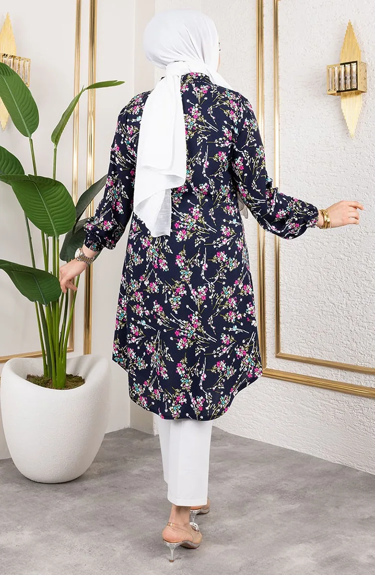 Asel Tunique Viscose Fleurie 0174-03 Bleu Marine 0174-03