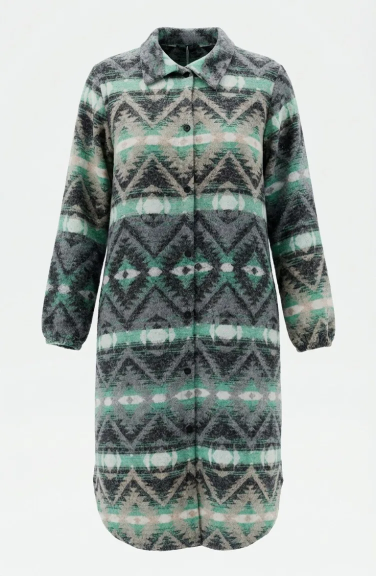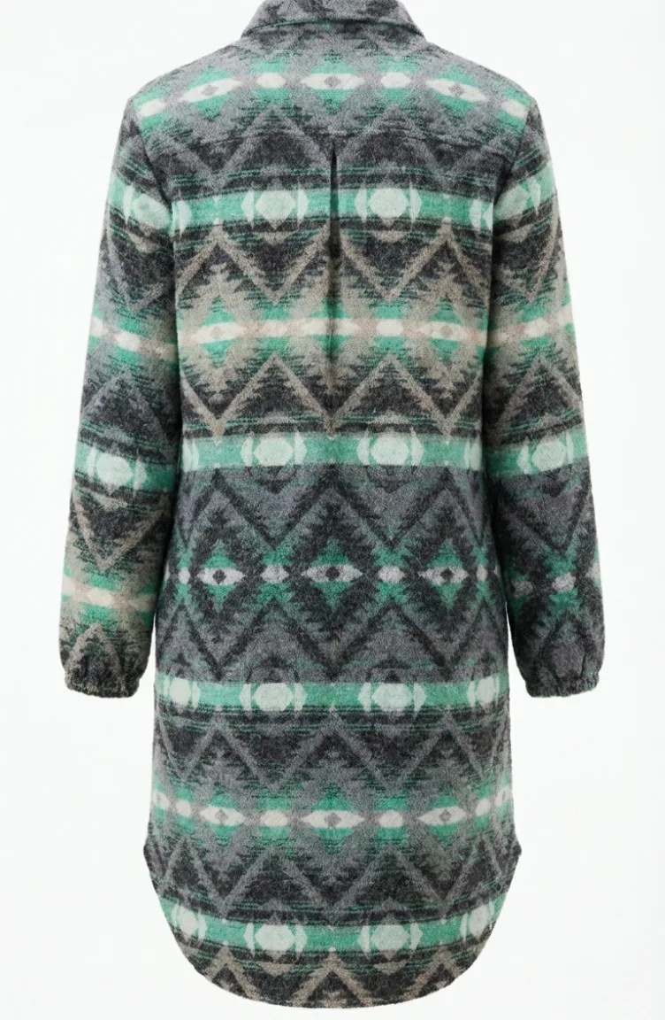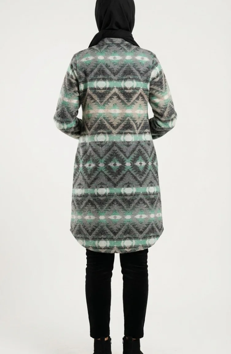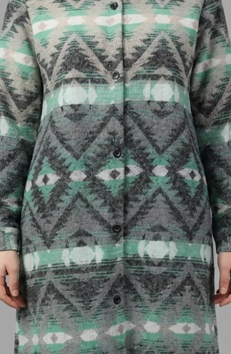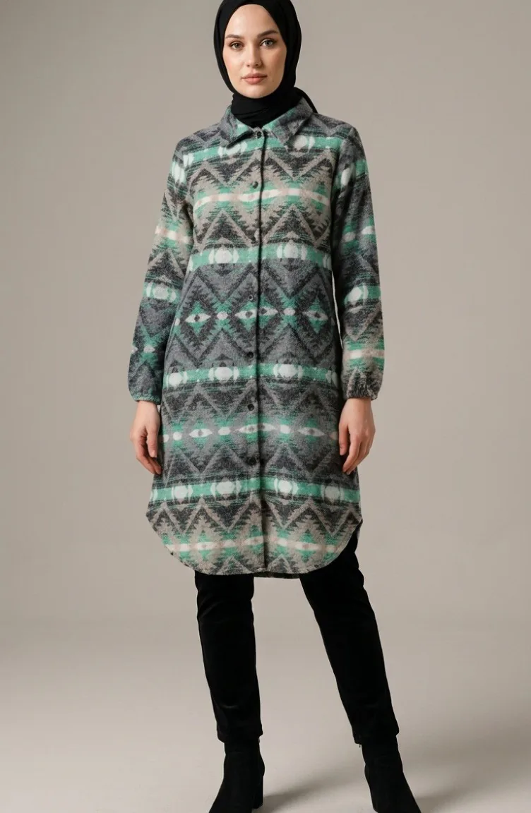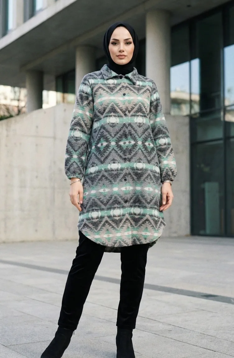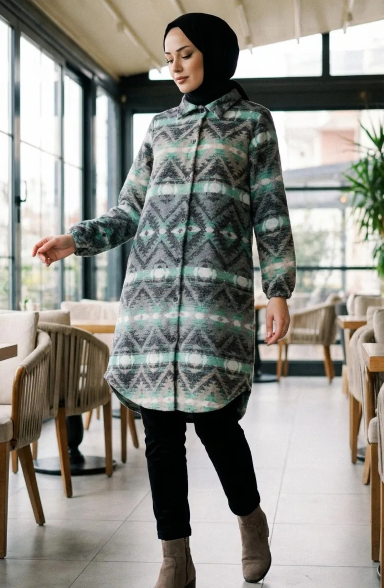 Couleur antracite. Tissu polyester. Tissu à motifs. Avec boutons. Manches élastiques. Col Chemise. Hivernal. Option de grande taille disponible.