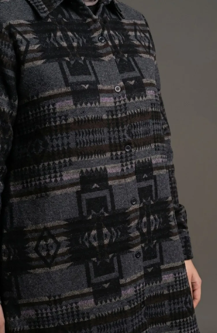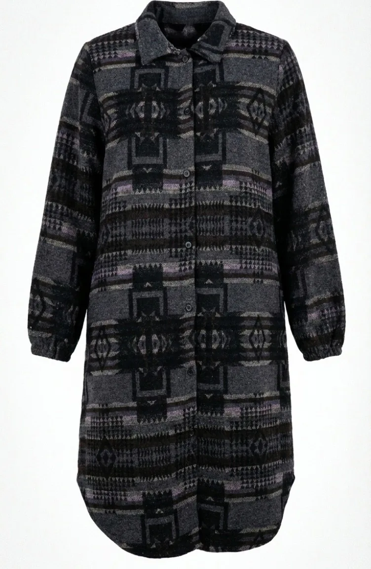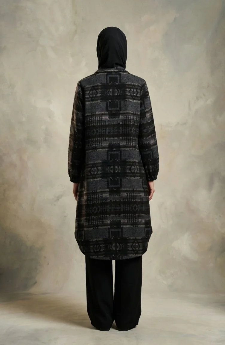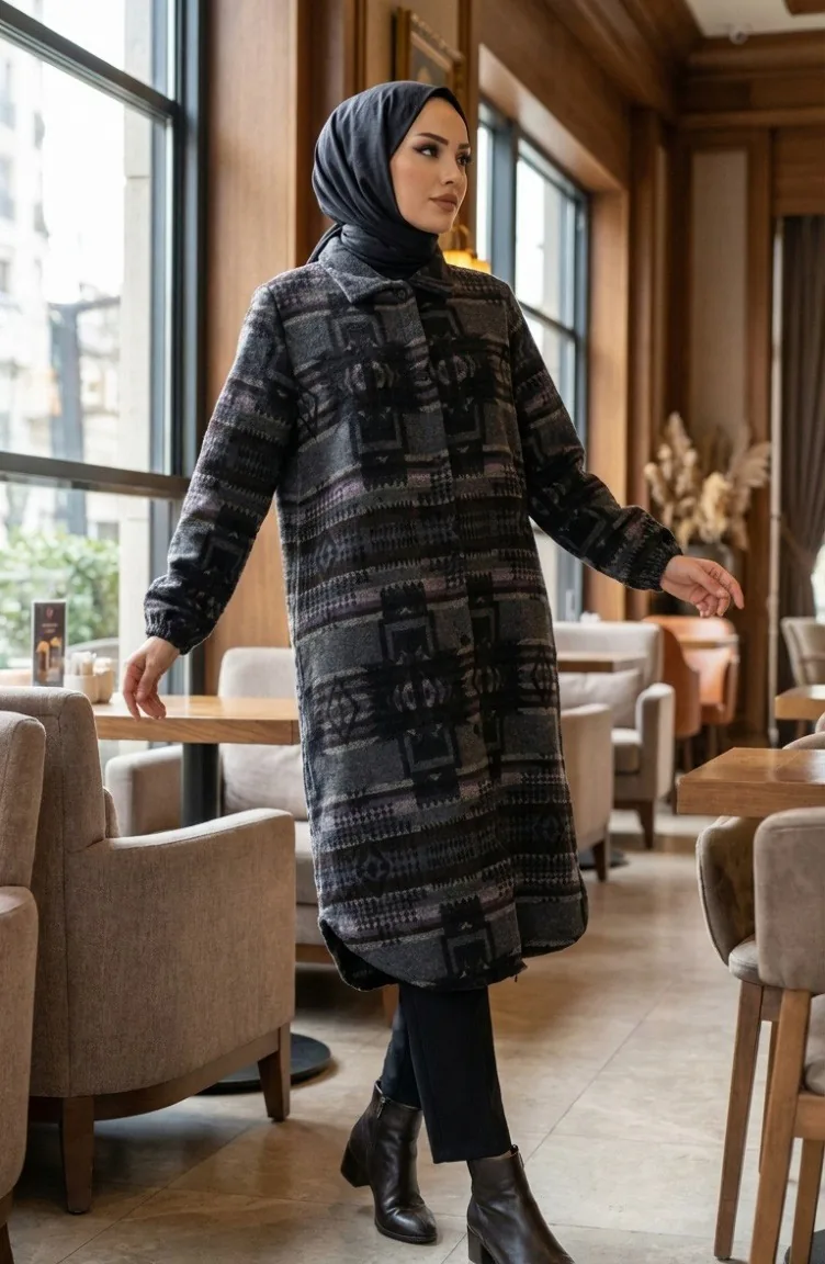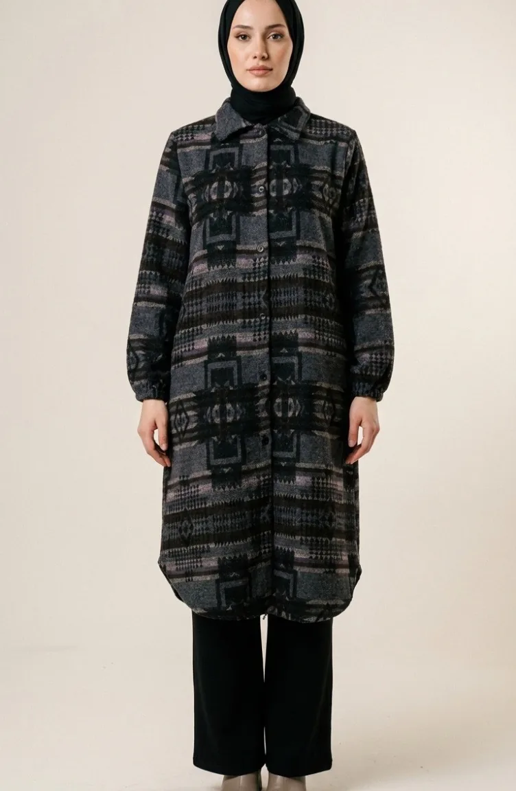Couleur antracite. Tissu polyester. Tissu à motifs. Avec boutons. Manches élastiques. Col Chemise. Hivernal. Option de grande taille disponible.