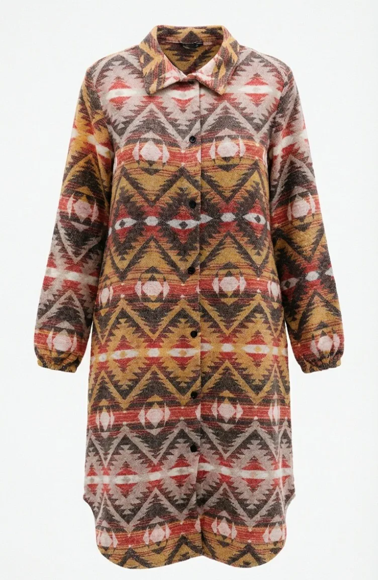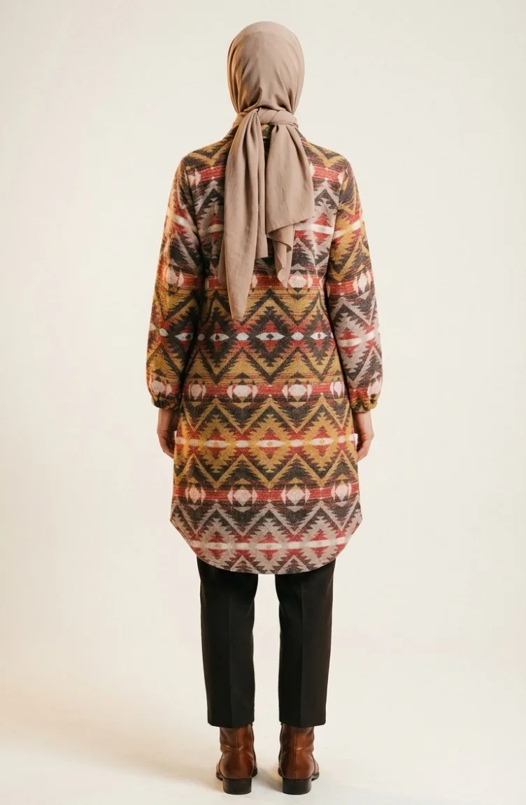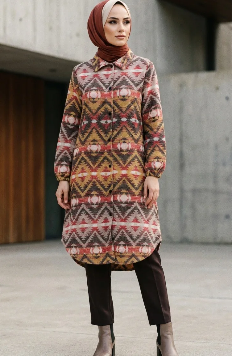 Couleur Brun. Tissu polyester. Tissu à motifs. Avec boutons. Manches élastiques. Col Chemise. Hivernal. Option de grande taille disponible.