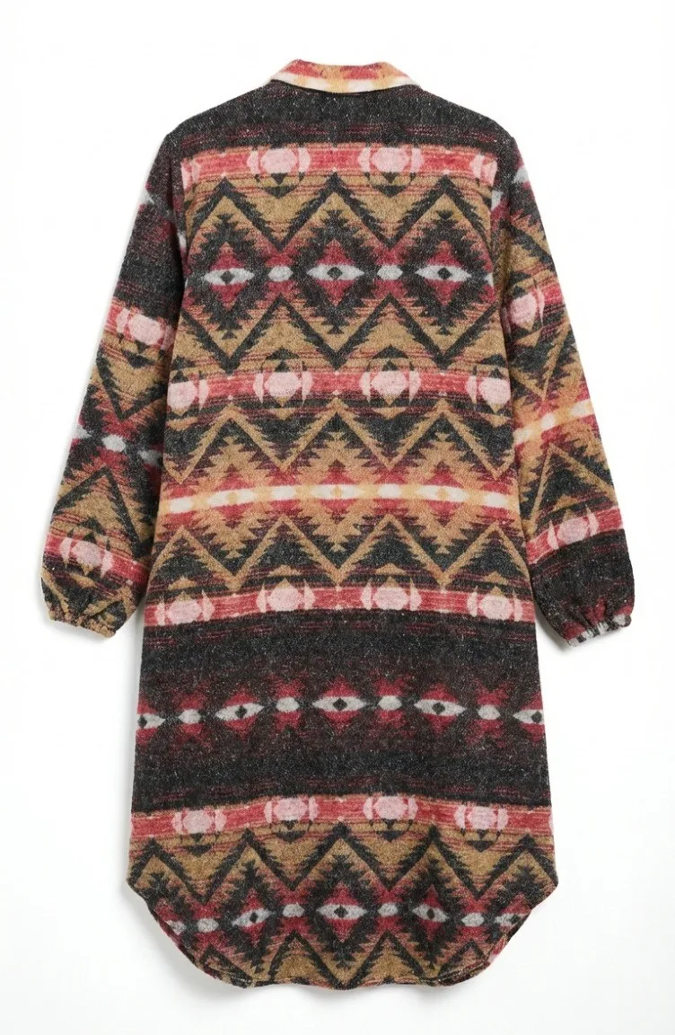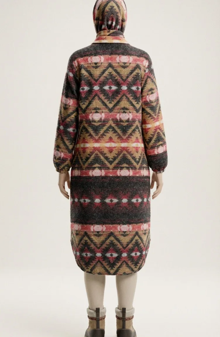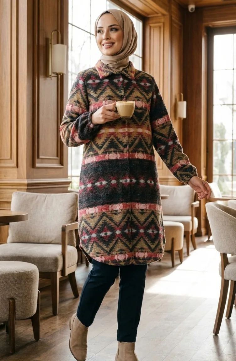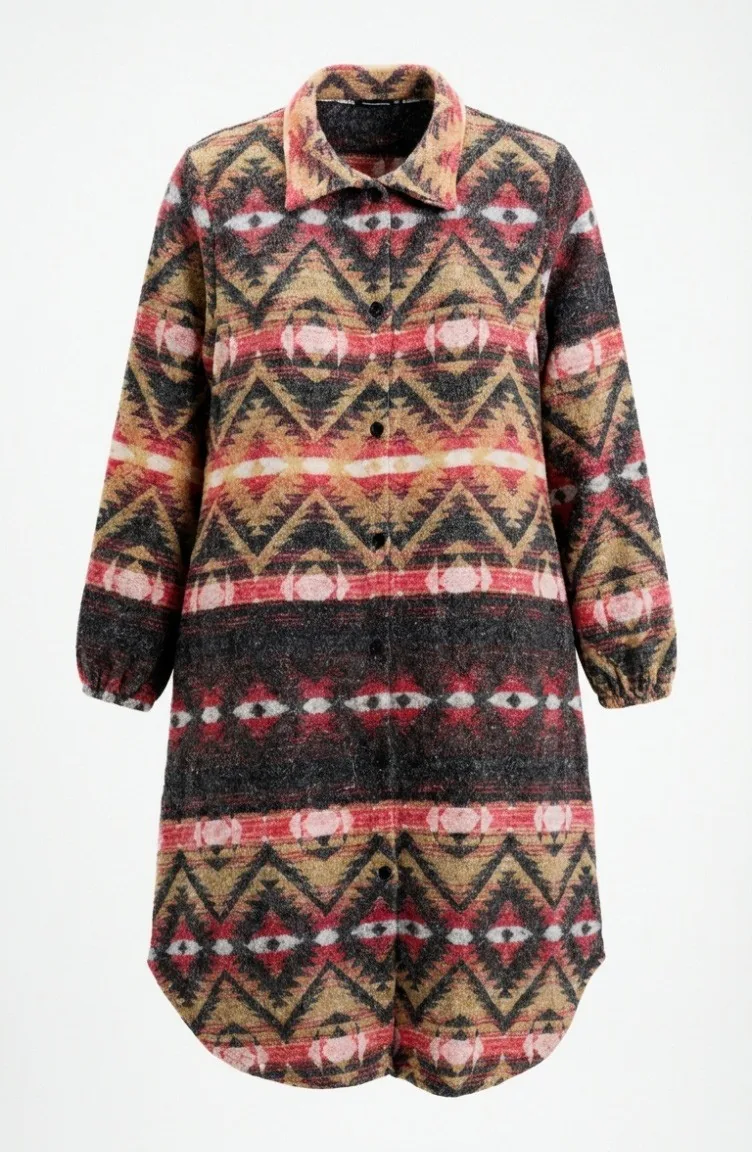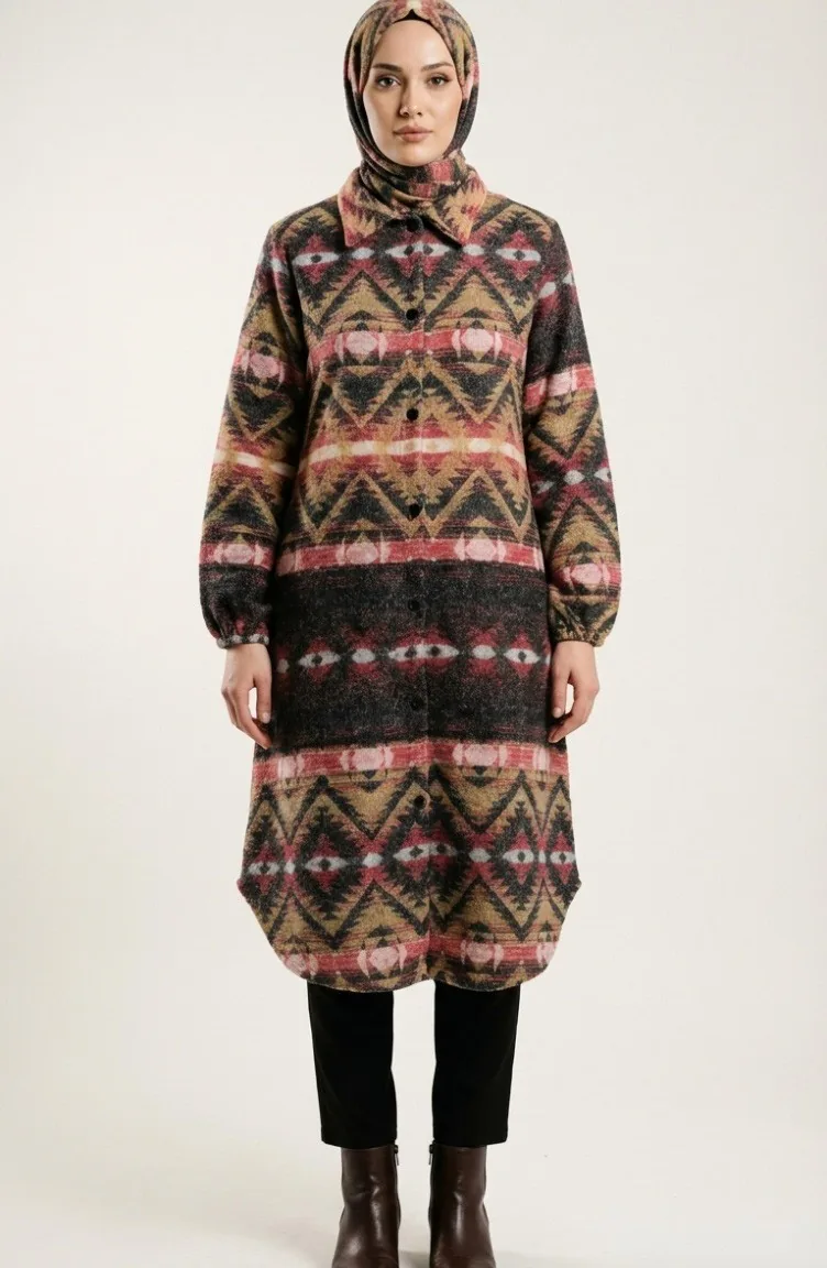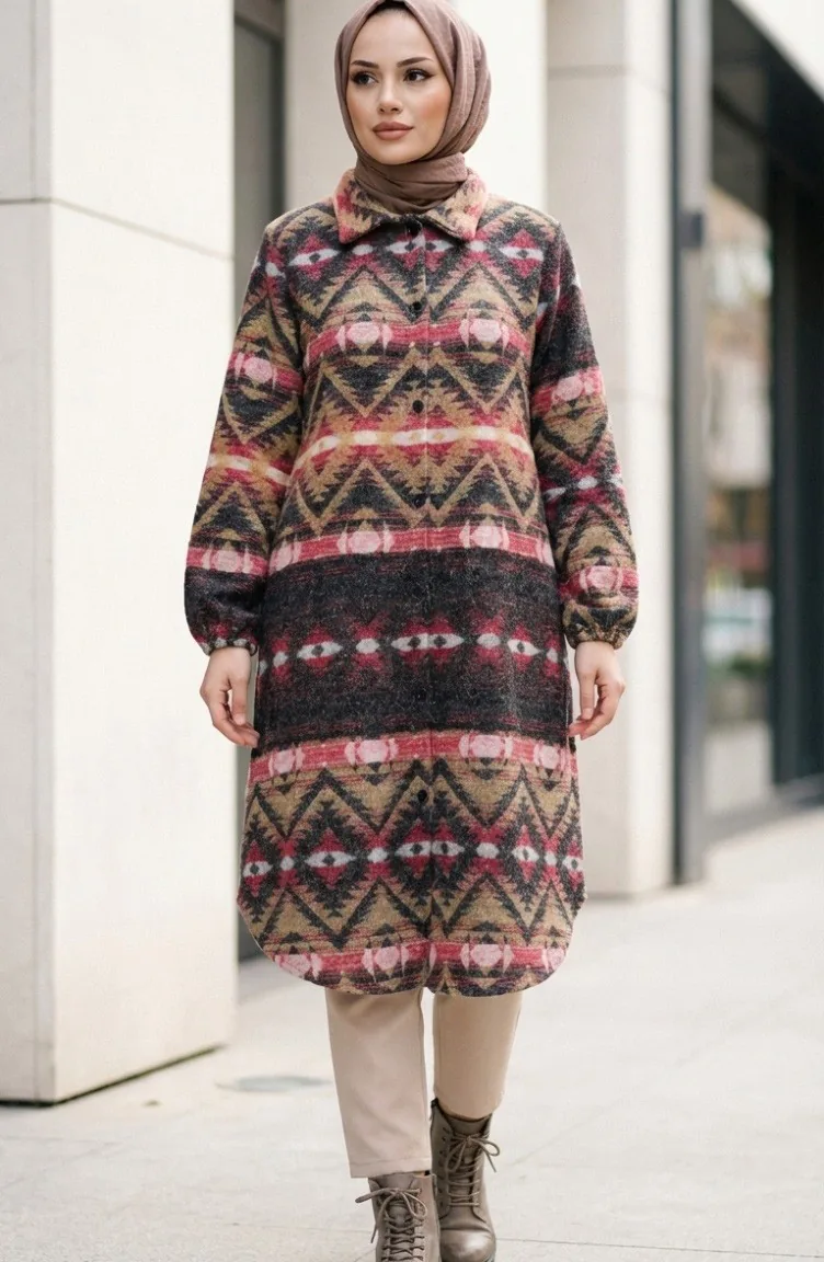 Couleur Corail. Tissu polyester. Tissu à motifs. Avec boutons. Manches élastiques. Col Chemise. Hivernal. Option de grande taille disponible.